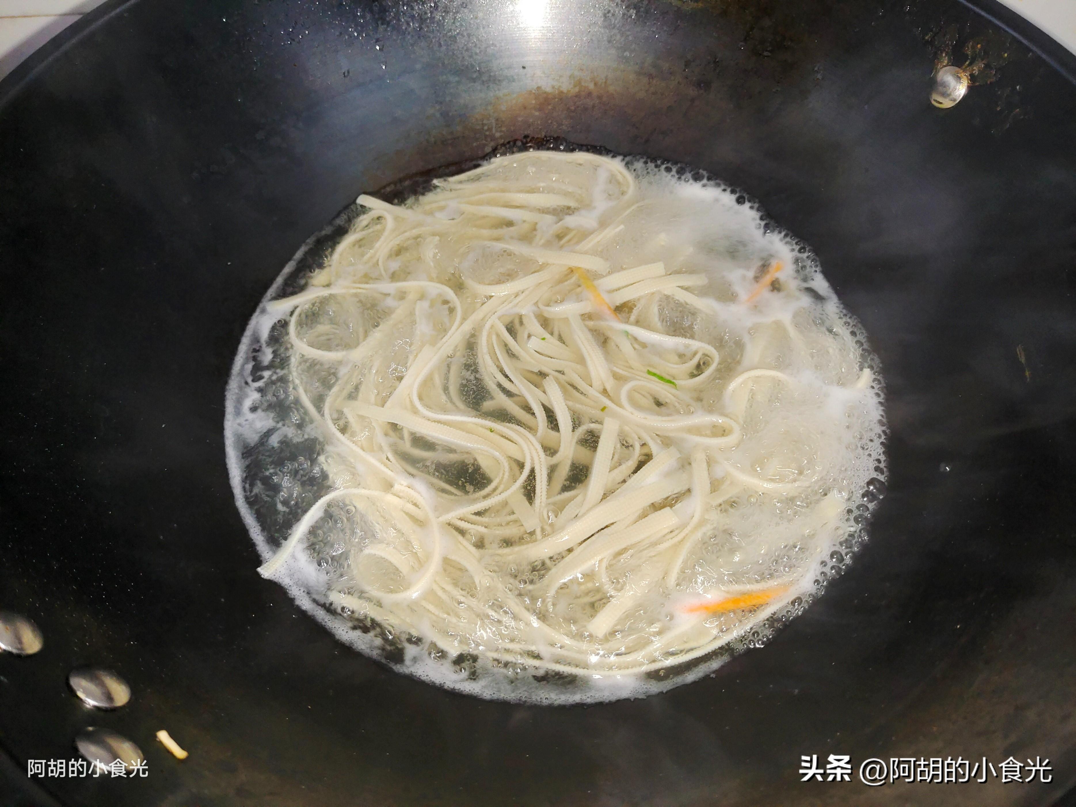 第五步:直接往鍋中衝入開水適量,把千張絲和胡蘿蔔絲一塊倒入鍋中,調味就加入一些食鹽和雞精即可,就這樣簡單煮個兩三分鐘左右。