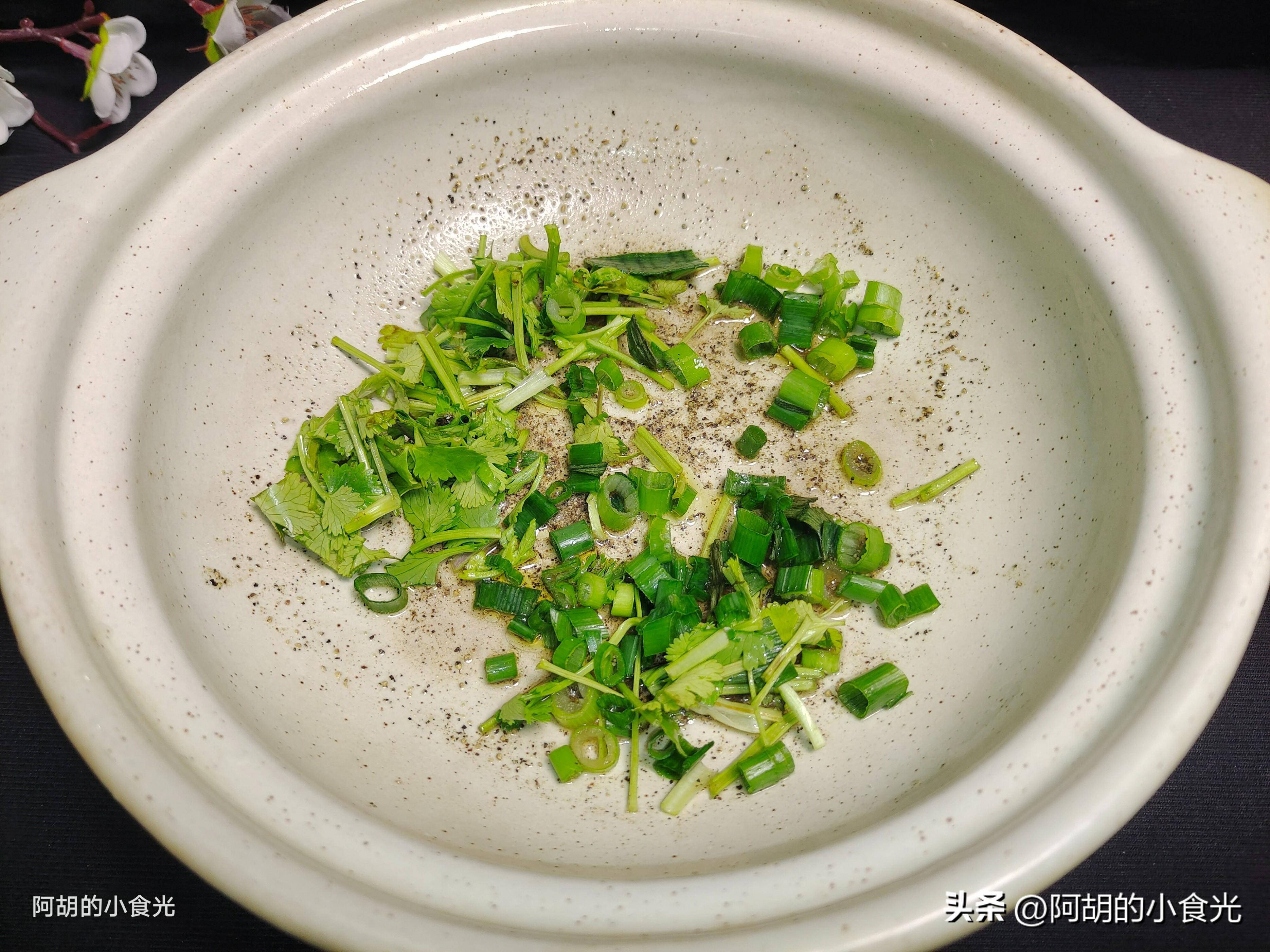 第三步:燒湯之前還要將湯碗中的調味料提前備好,這樣湯煮好後直接衝入其中攪拌一下就可以上桌。湯碗中撒入多一些的黑胡椒粉、一些白米醋或者香醋都可以,再來一湯匙的芝麻香油,再把蔥花和香菜碎也加入其中備用。
