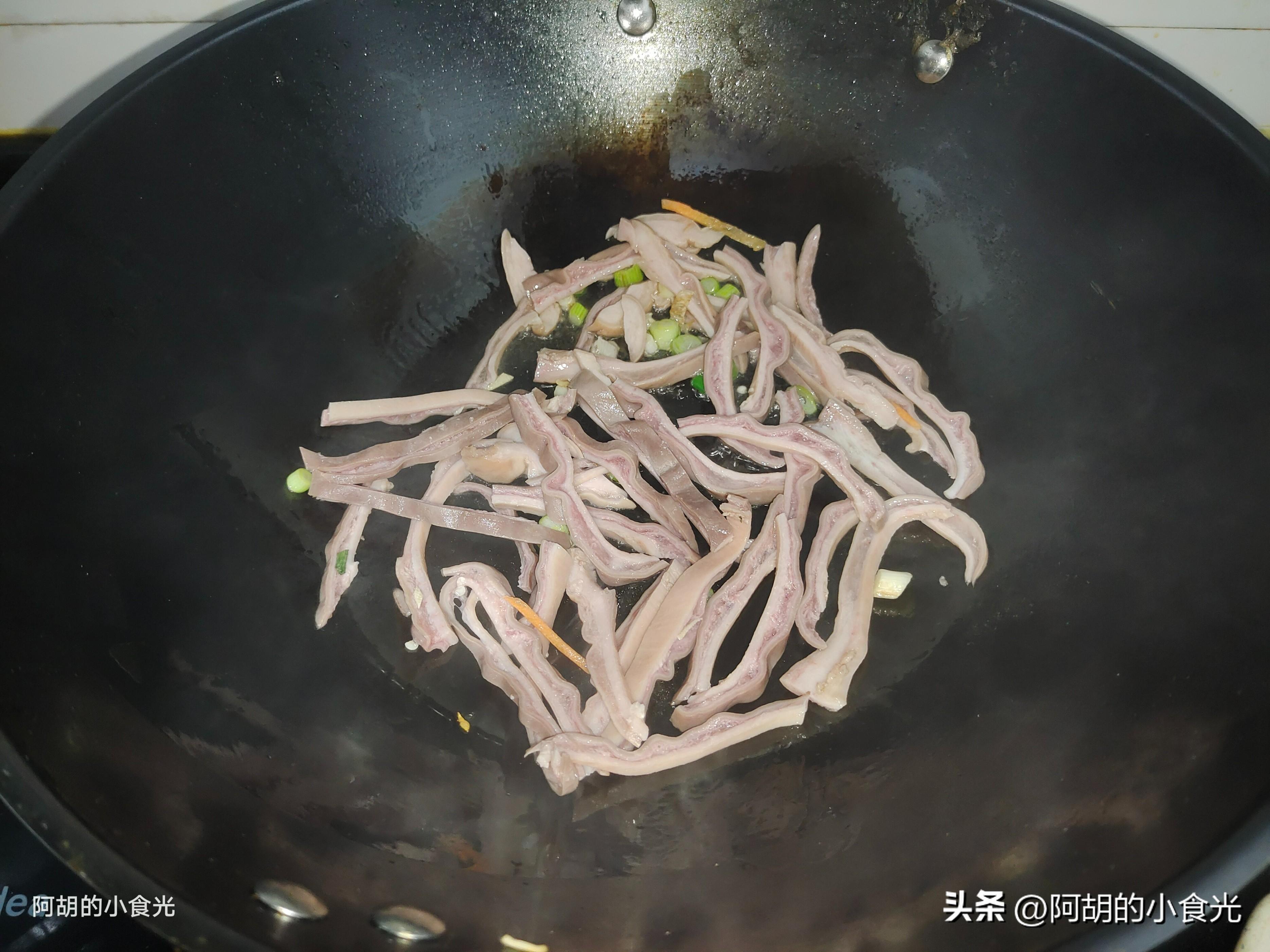 第四步:下面就來燒湯。鍋烘乾後淋入一些花生油燒熱,加入一些蔥花薑絲炒出香味,接着把豬肚條下鍋簡單炒一炒。