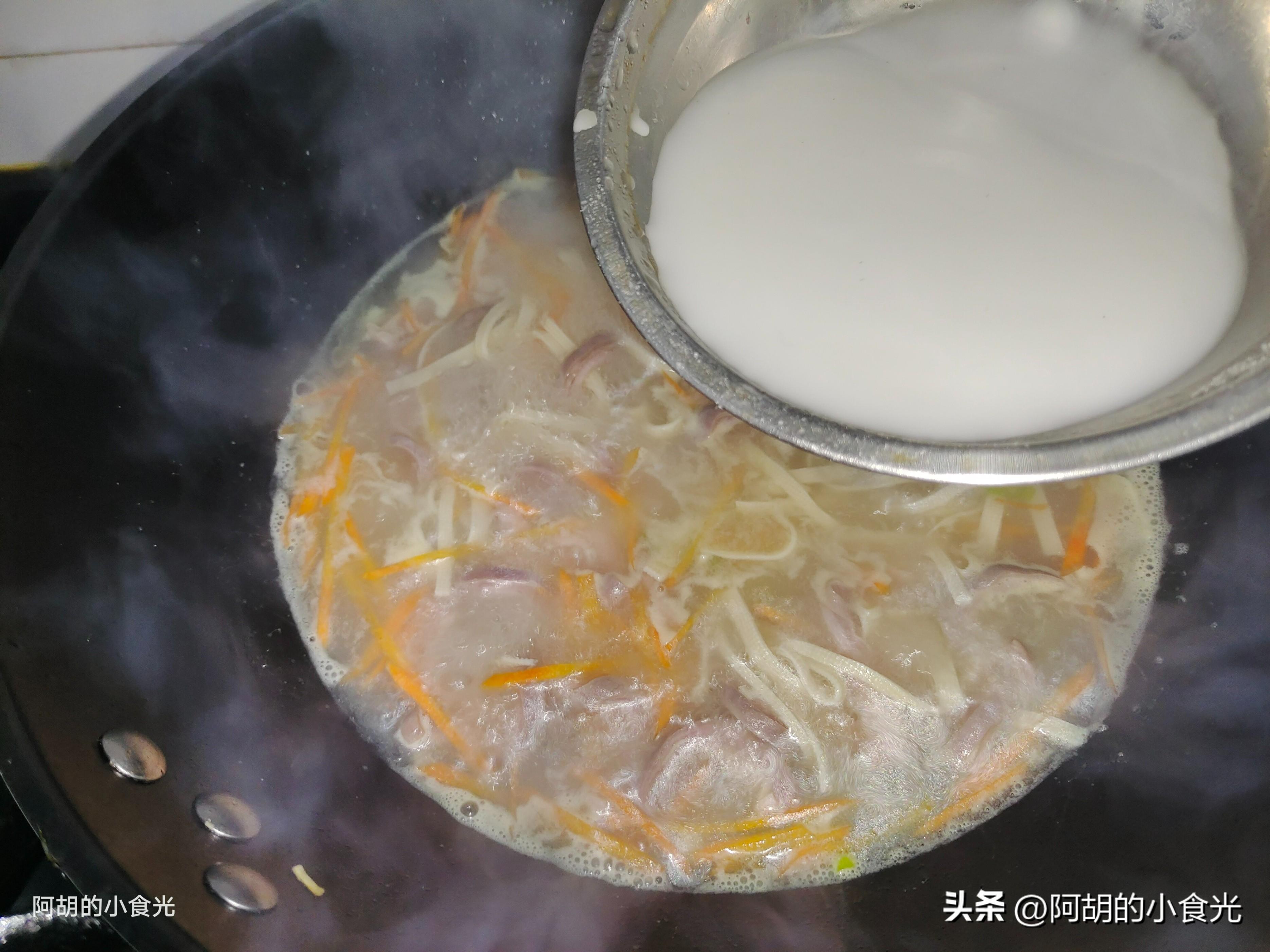 第六步:用涼水稀釋一些玉米澱粉攪勻,而後鍋內保持大火把澱粉水淋入鍋中,同時用勺子攪拌直至湯水呈現一些稠度即可。