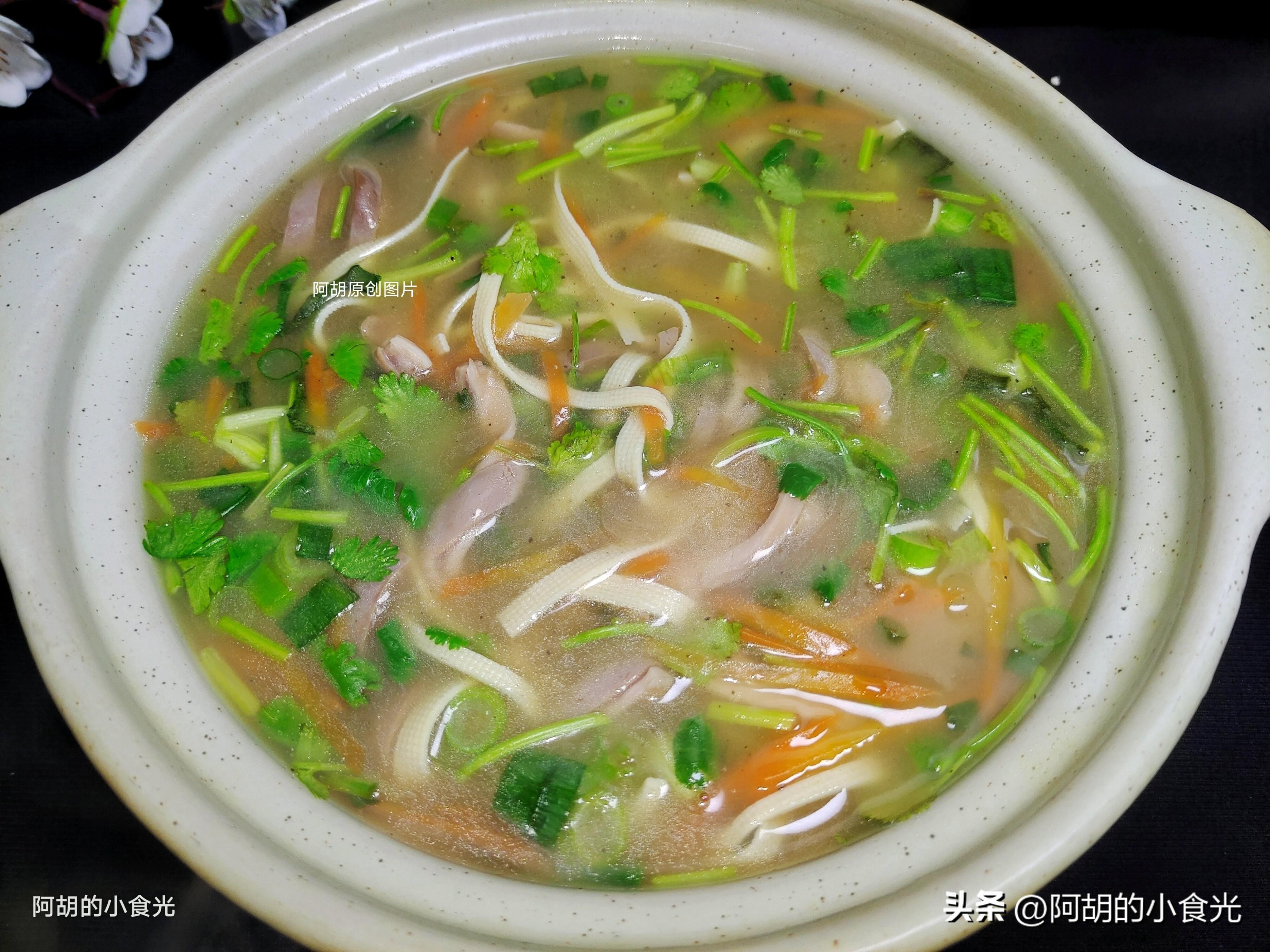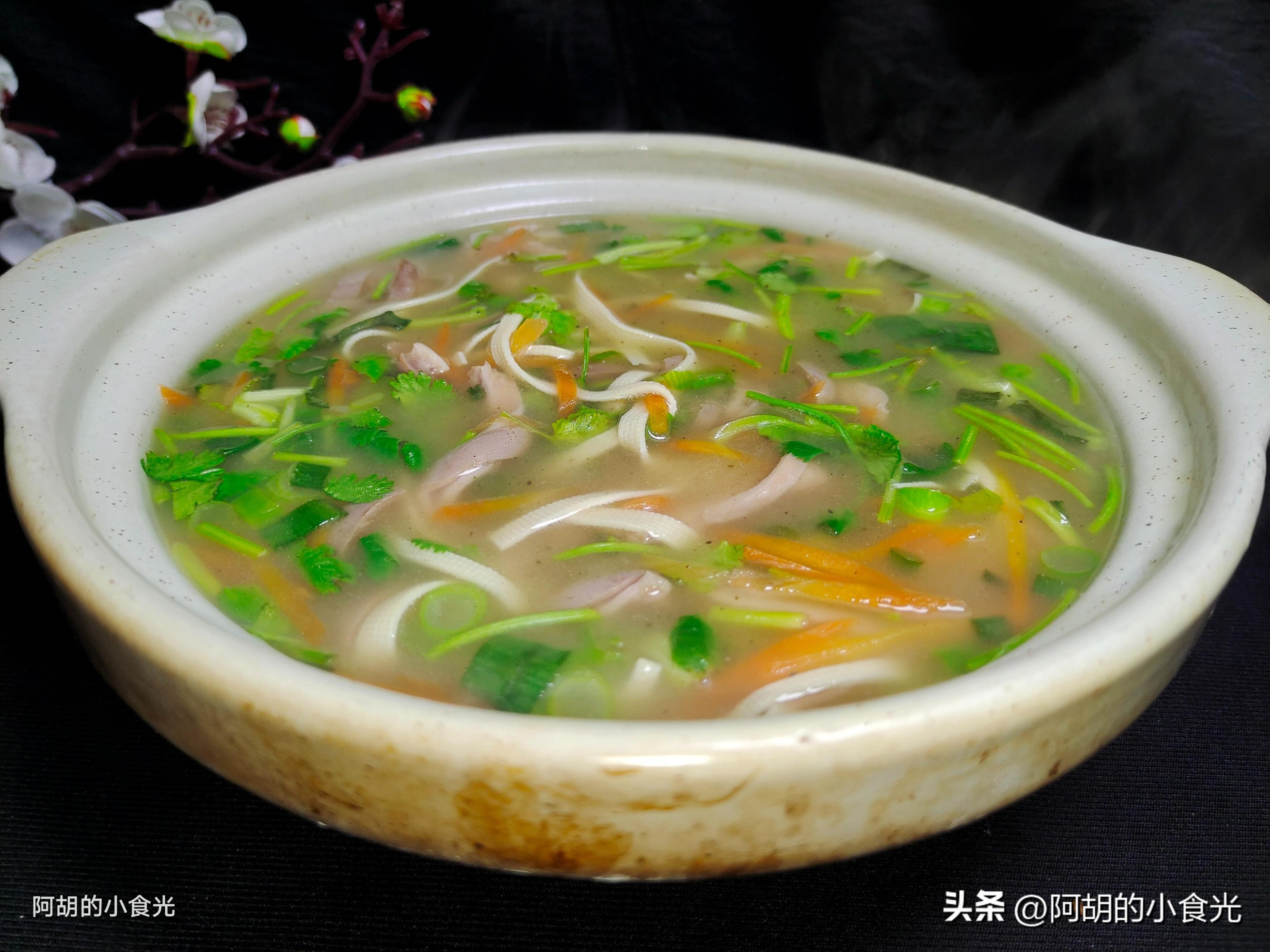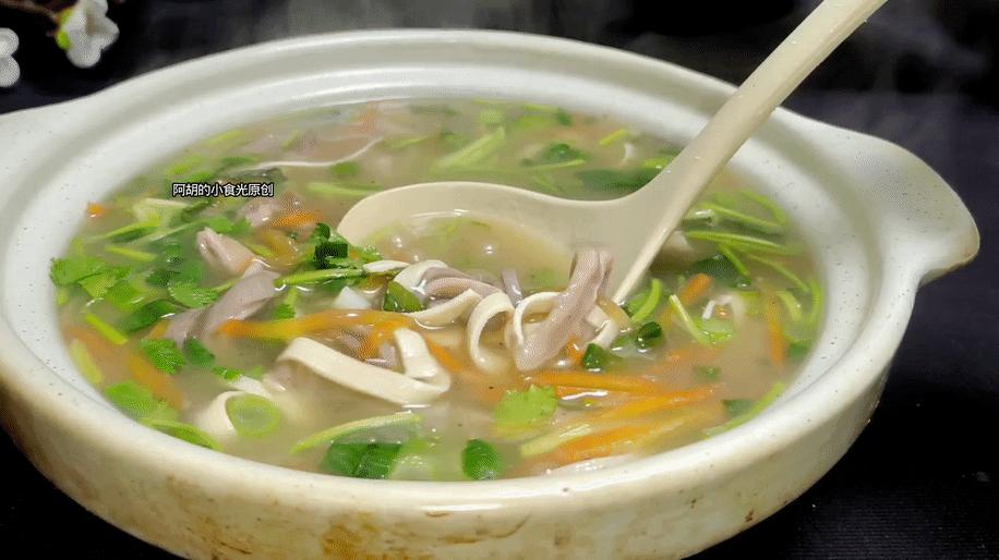 今天這道是爲羹湯,主要的食材有豬肚絲、胡蘿蔔、千張等,口味爲酸辣味的,主要由胡椒粉、米醋和芝麻香油提供味道,還有豬肚的鮮香脆嫩的味道和口感,更爲這道湯添加了不少層次,雖然做法很簡單,但上桌一定很受歡迎,值得試一試。