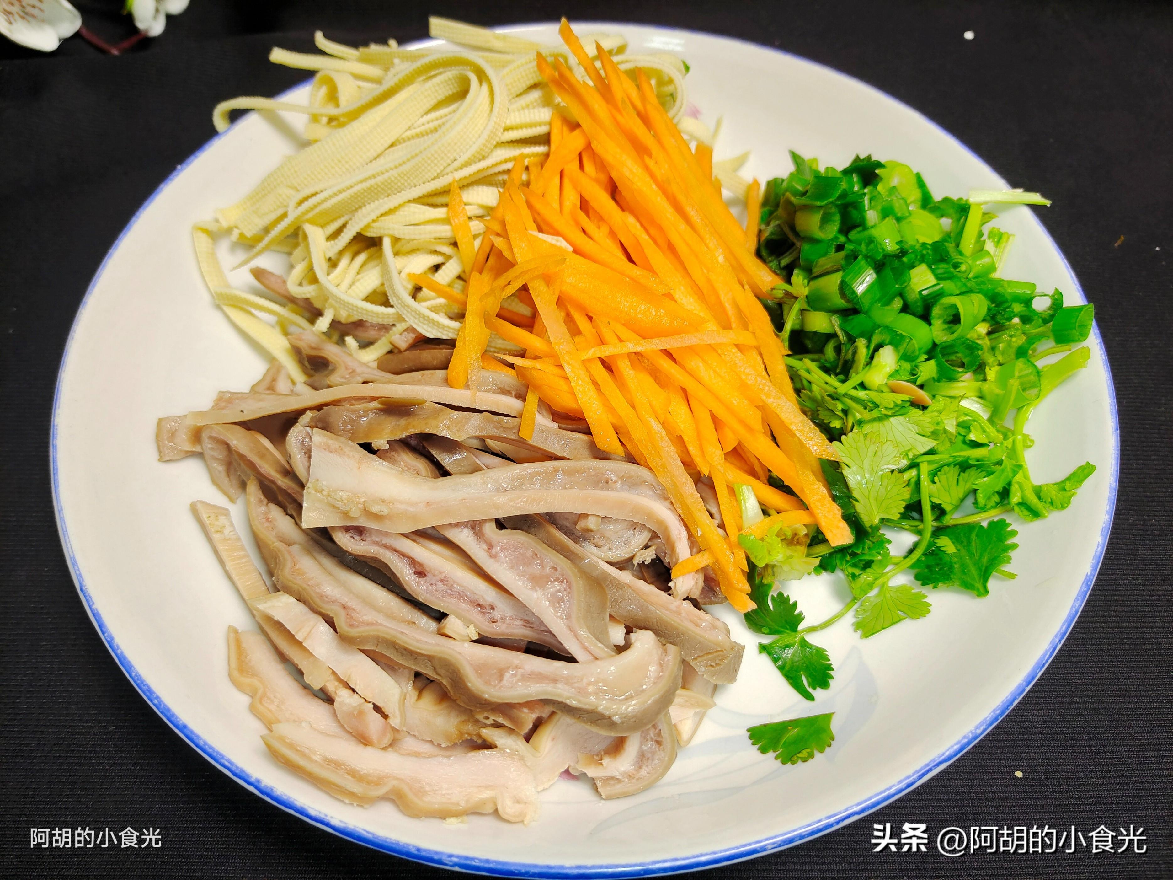 食材準備:滷豬肚半個,胡蘿蔔一小塊,千張一片,香菜兩棵,蔥花適量,黑胡椒粉適量,芝麻香油適量,白米醋適量,花生油適量,澱粉水適量,雞精少許