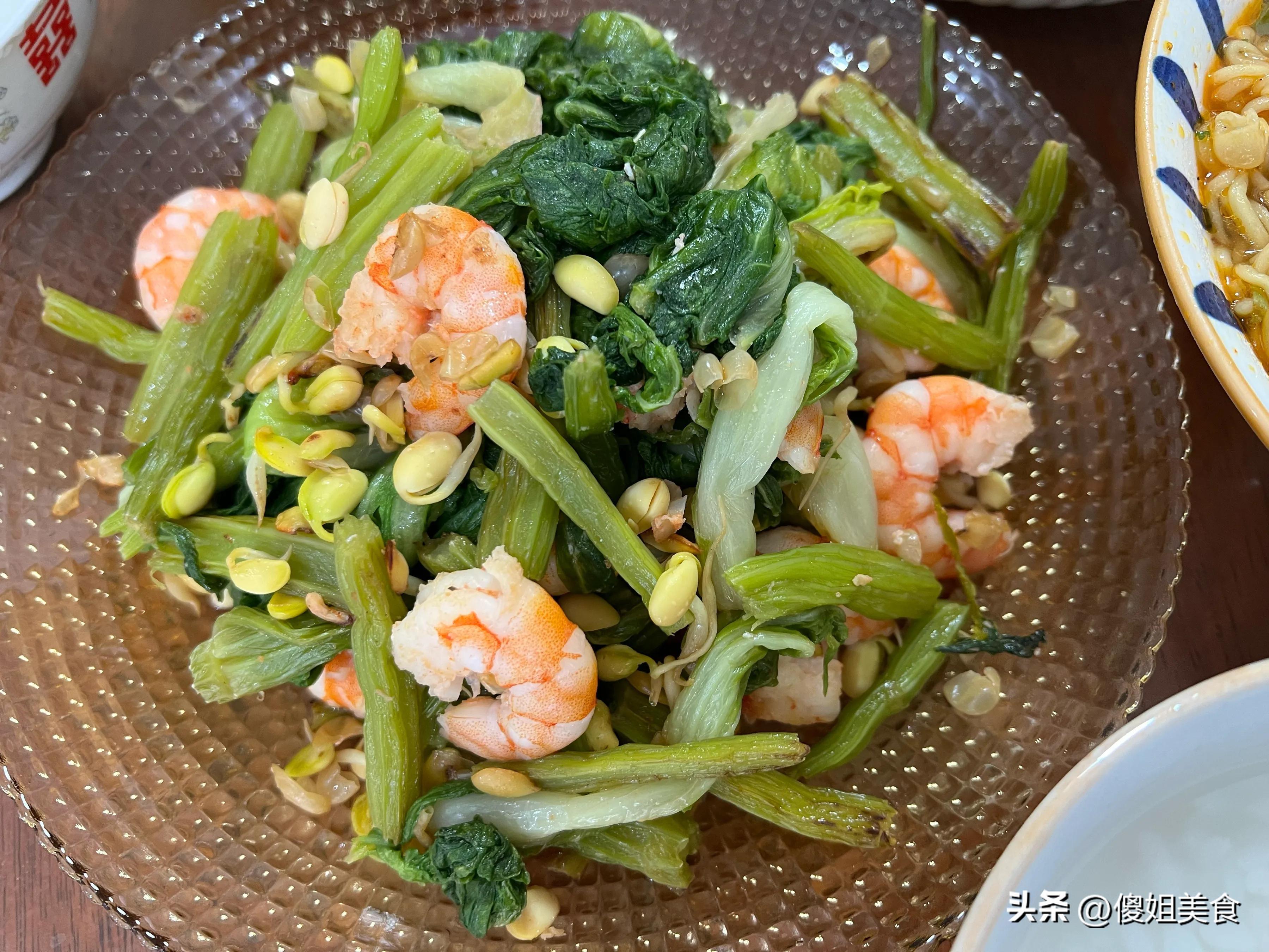 兩個人,就炒了一個菜,可這一個菜裏頭,內容可豐富了。芹菜碧綠碧綠的,小白菜嫩生生的,黃豆飽滿圓潤,還有幾隻大蝦仁點綴其間。這麼一混合炒,味道肯定也差不了。我媽後來跟我說,買菜時看到芹菜新鮮就買了點,小白菜是昨天剩的幾棵,黃豆芽是超市打折買的,蝦仁是冰箱裏凍的存貨,這麼一搭配,蔬菜種類都超過三樣了,一點兒都不單調。