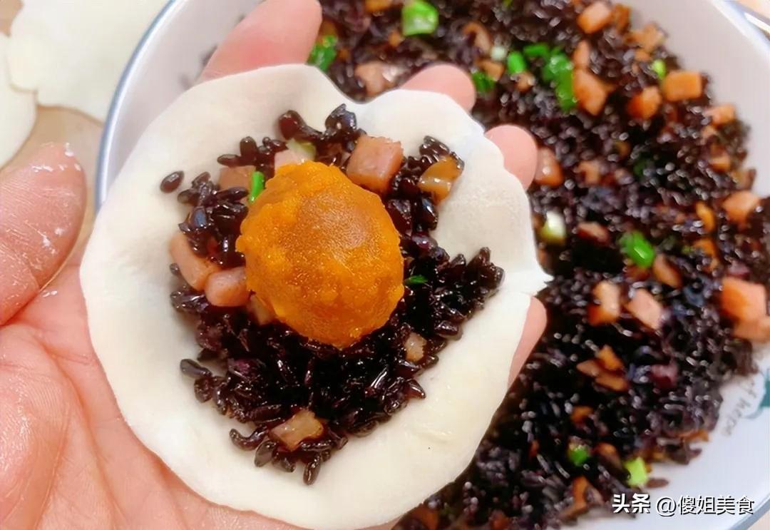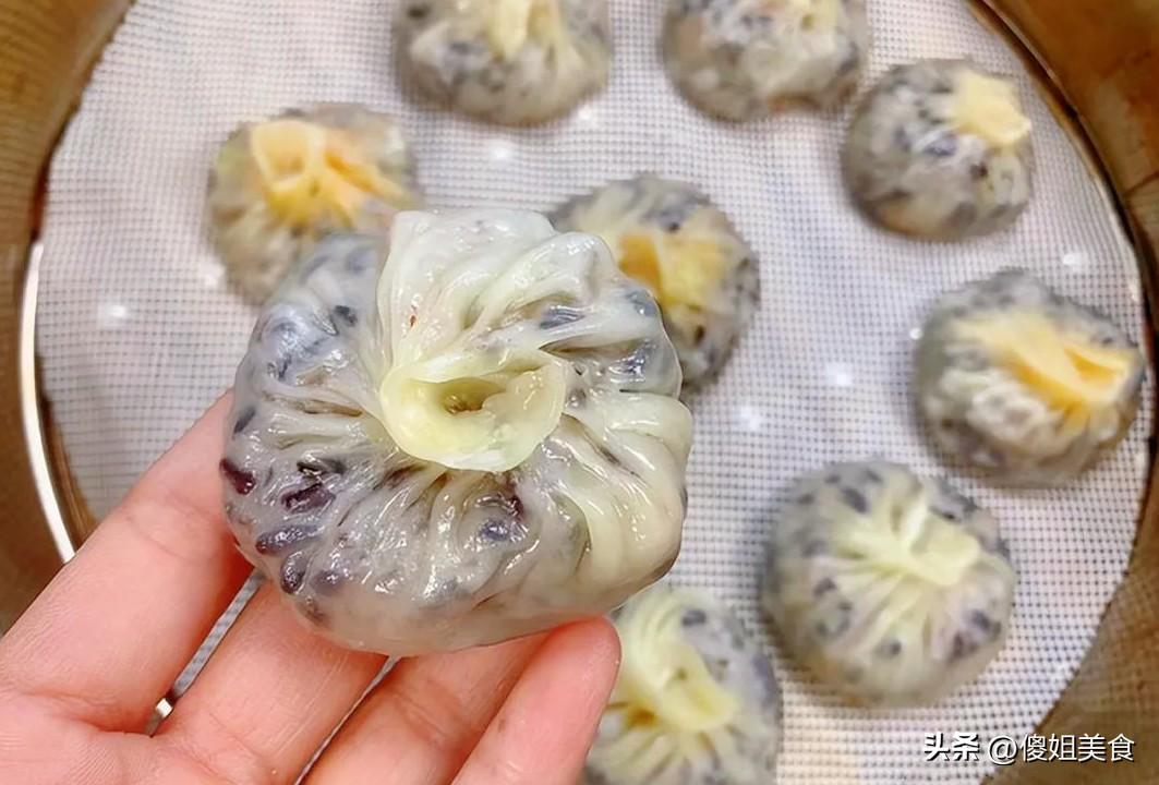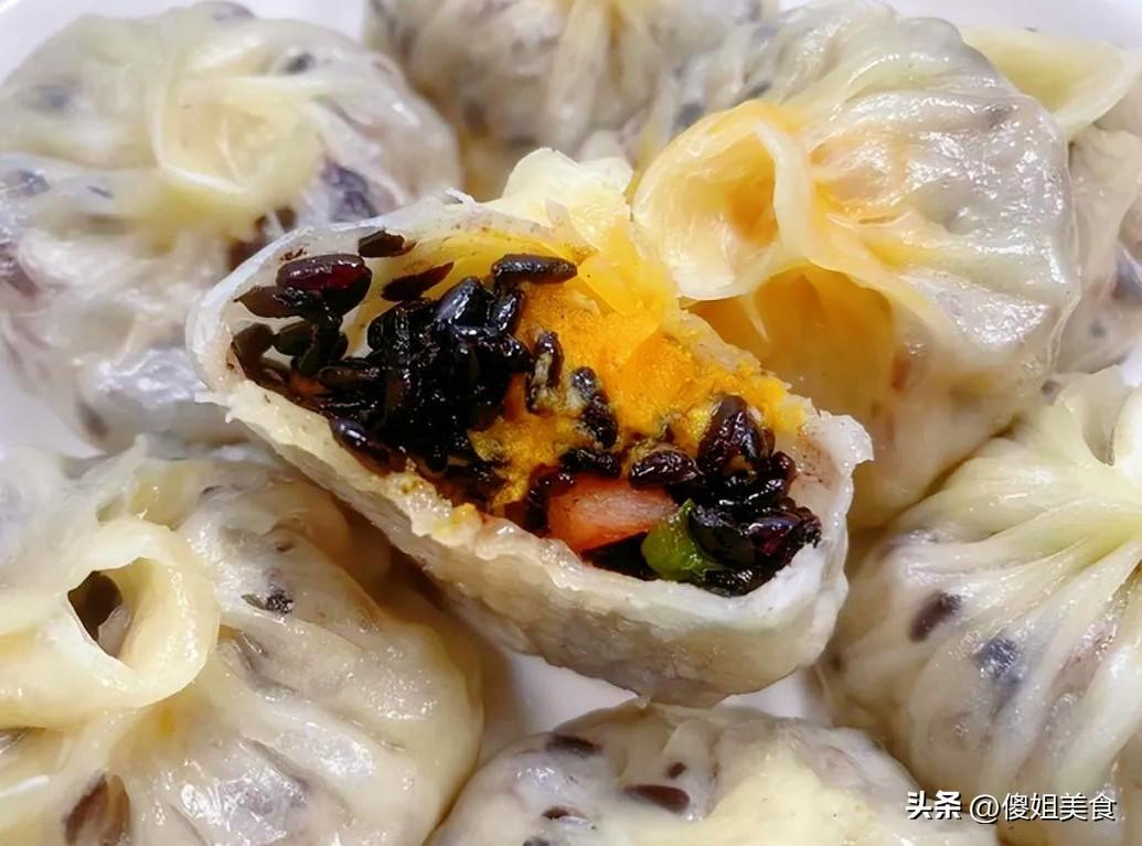 燒麥大家都喫過,但黑米做的可能試過的人不多。黑米自帶着一股特殊的香氣,糯中帶韌,比普通糯米更有嚼頭,而且顏色紫黑紫黑的,看着就暖呼呼的。配上香腸的鹹香、香菇的鮮美,再裹進現成的餃子皮裏,那味道絕了。