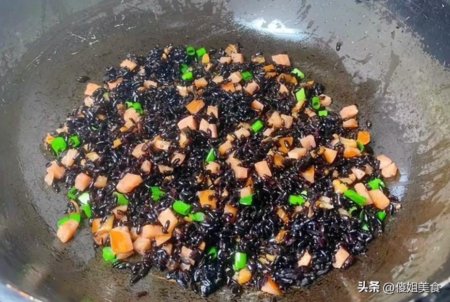 黑米一下鍋,熱氣裹着香腸的油脂,香味“轟”一下就上來了,加鹽、撒胡椒粉,翻炒均勻,讓每一粒米都裹上油光。最後關火,把香蔥碎拌進去,餘溫剛好能把蔥香逼出來,又不至於讓蔥變黃。
