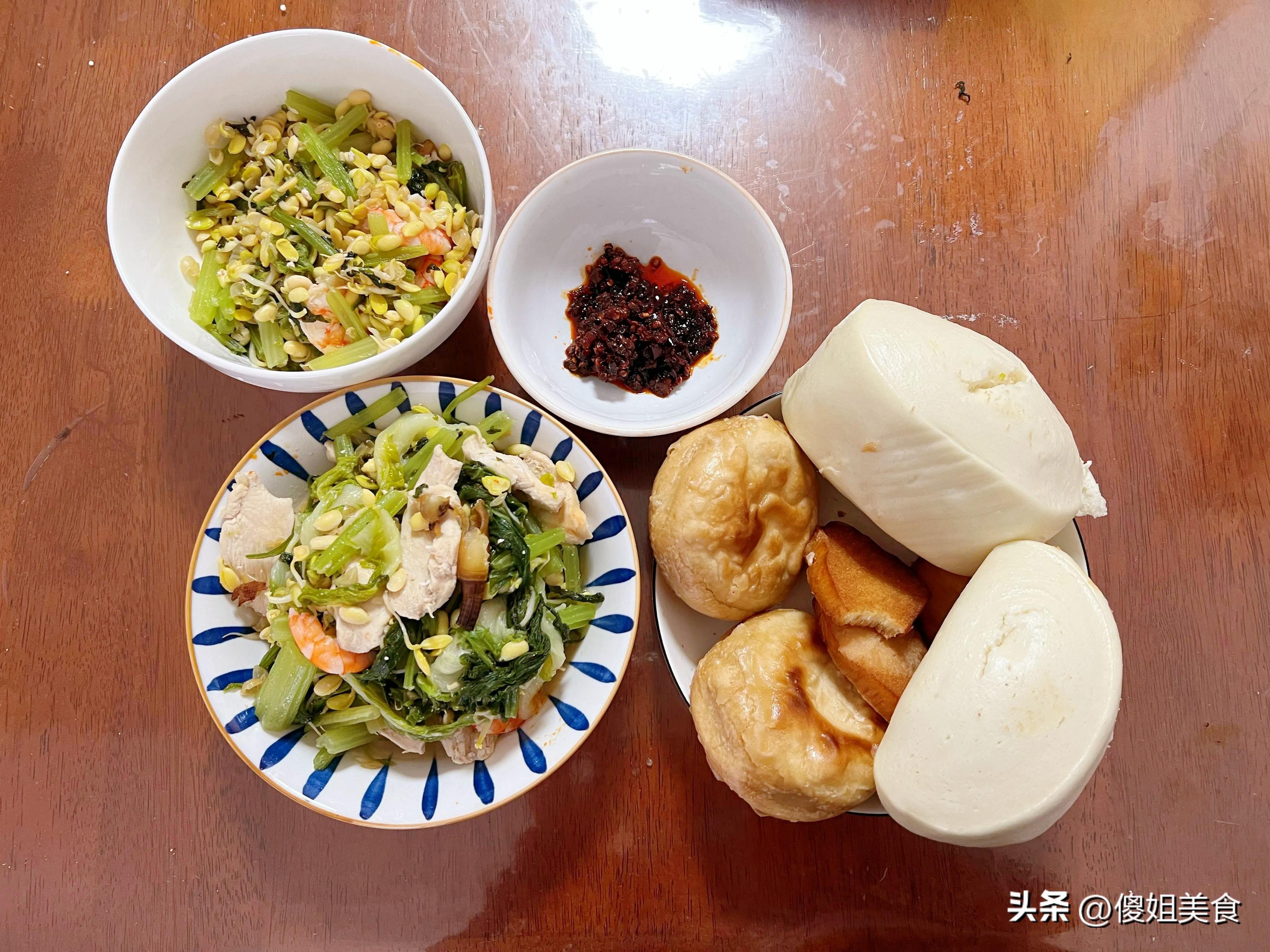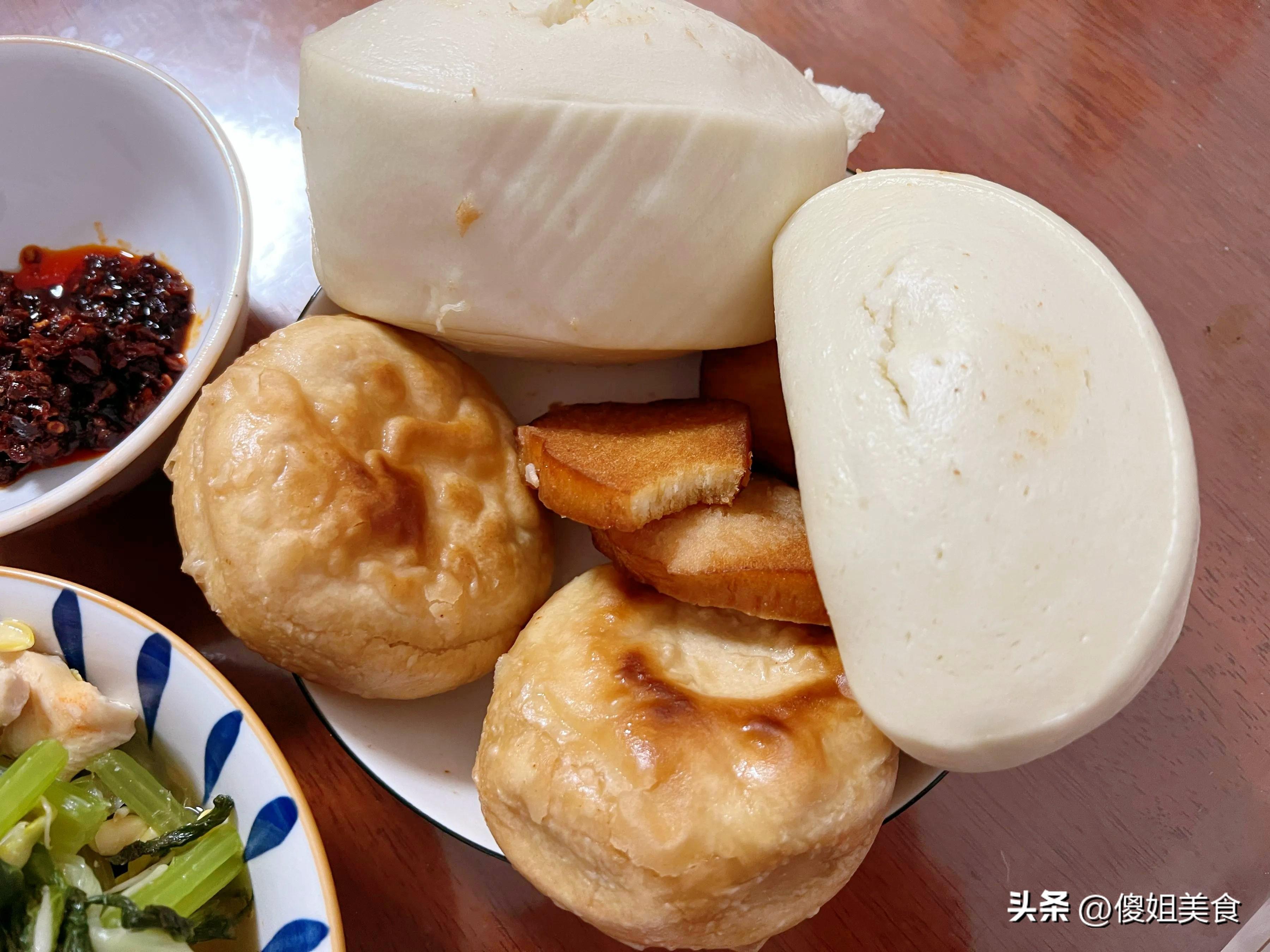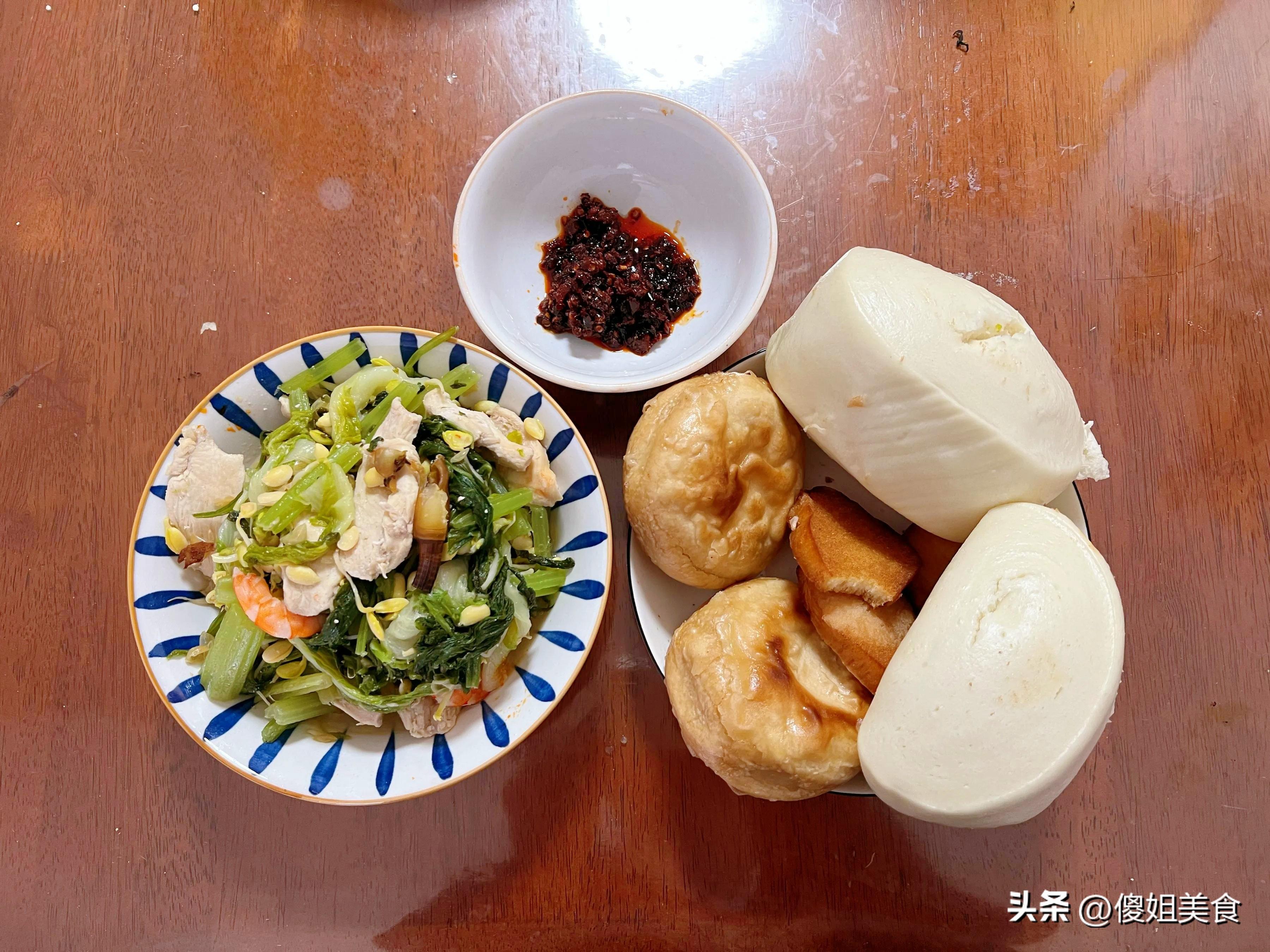 主食更是花樣多,饅頭是老媽自己蒸的,個個紮實有嚼勁;火燒是從小區門口那家老店買的,表皮焦脆,裏面層層分明;早上炸的饅頭片加熱了一下,還有兩根玉米,一看就是甜玉米,粒粒飽滿。桌子角上還放着個小碗,裏面是喫剩的小半碗老乾媽辣醬。老爸就愛這一口,說是“下飯神器”。