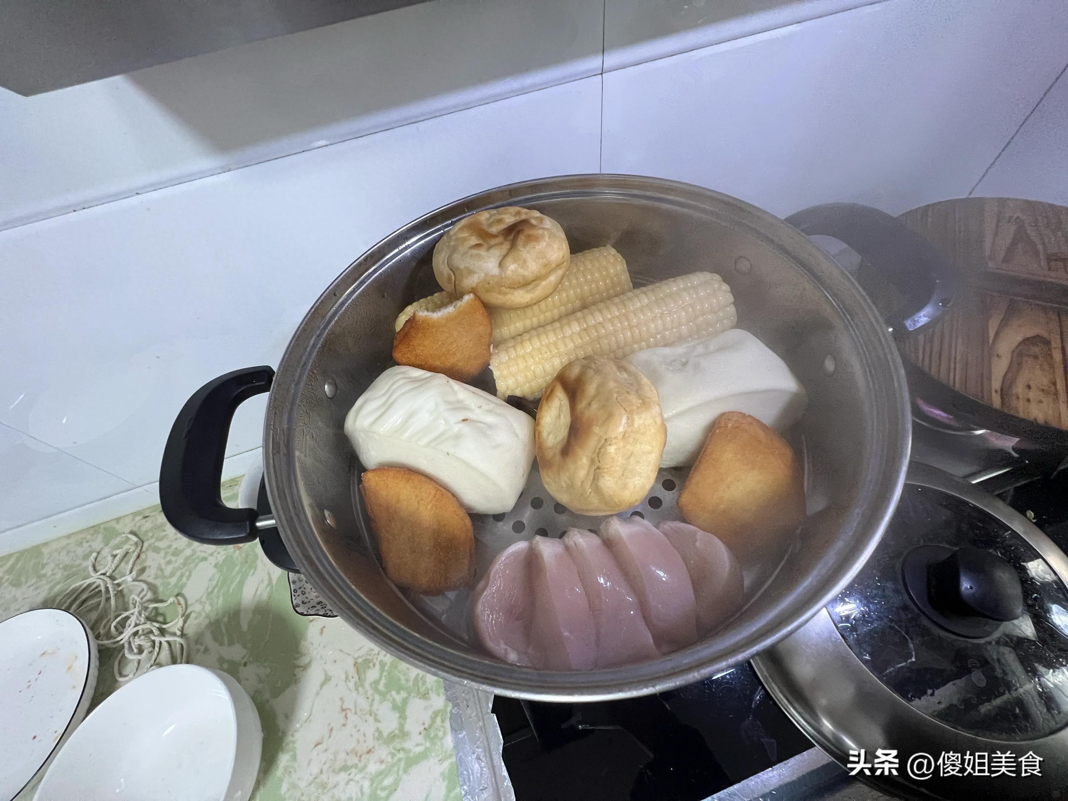 我想想也是,老兩口年紀大了,晚飯確實不宜多喫。這一鍋熱乎乎的大雜燴,有葷有素,湯湯水水的喫着也舒服。饅頭片脆,火燒香,玉米甜,想喫什麼口味都能滿足。
