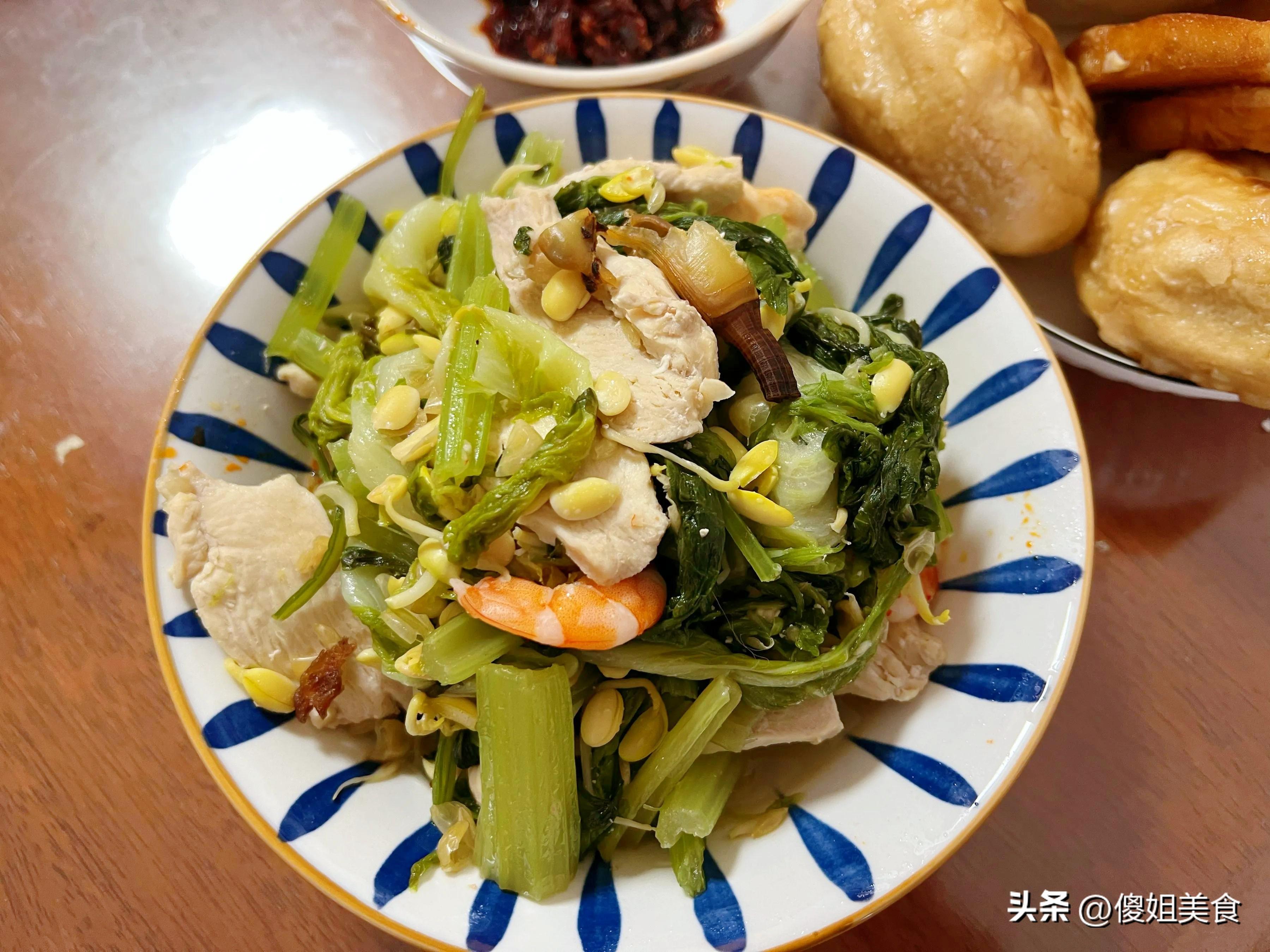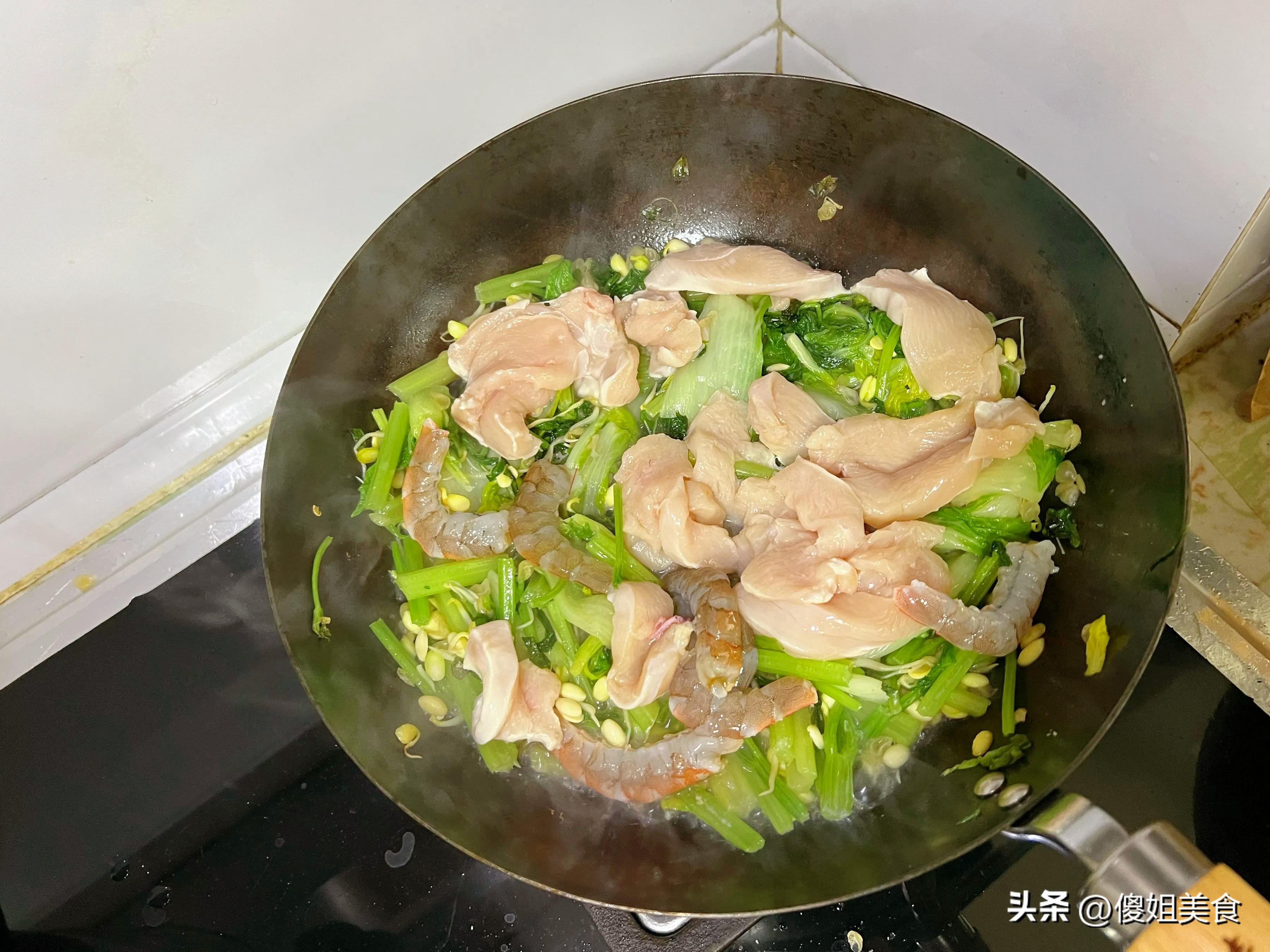 先說說那鍋大雜燴,雖然看起來是一鍋煮,但裏面的內容可不少:有芹菜、黃豆芽、雞胸肉撕、還有七八隻大蝦,既有蝦的鮮,又有蔬菜的甜,雞胸肉吸飽了湯汁一點也不柴。