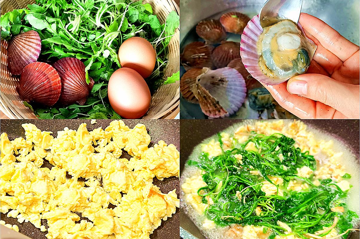 1. 薺菜洗淨切段;扇貝肉洗淨(如果是乾的需提前泡發);雞蛋打散備用。