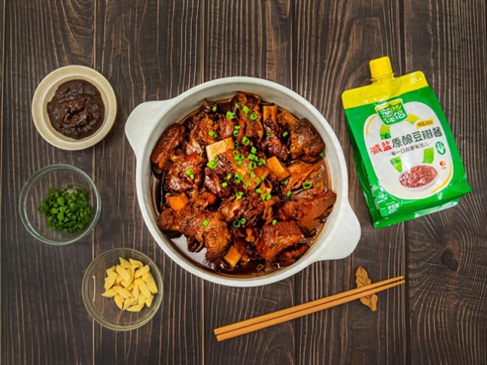 牛肋排本身肉質緊實、油脂分佈均勻,適合長時間燜燉入味。這道醬香牛肋排以蔥伴侶減鹽原釀豆瓣醬作爲主要調味,小火慢炒激發醬香,再通過長時間燜煮讓牛肉充分吸收醬汁。採用減鹽配方,在保證醬香濃郁的同時,不會掩蓋牛肉本身的肉香,成菜口感酥爛不膩,湯汁拌飯、拌麪都十分合適,是典型的下飯肉菜。
