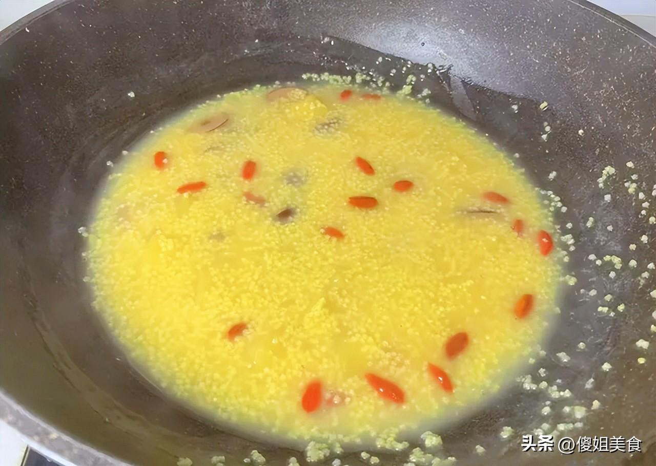 第三步:鍋里加足量的水,大火燒開。這裏有個關鍵點:一定要等水完全燒開沸騰了,再把小米倒進去。很多人熬小米粥容易清湯寡水,或者米是米、湯是湯,就是因爲用冷水下了米。開水下米,米粒會在高溫下迅速開花,更容易熬出稠糊糊、帶着厚厚米油的好粥。