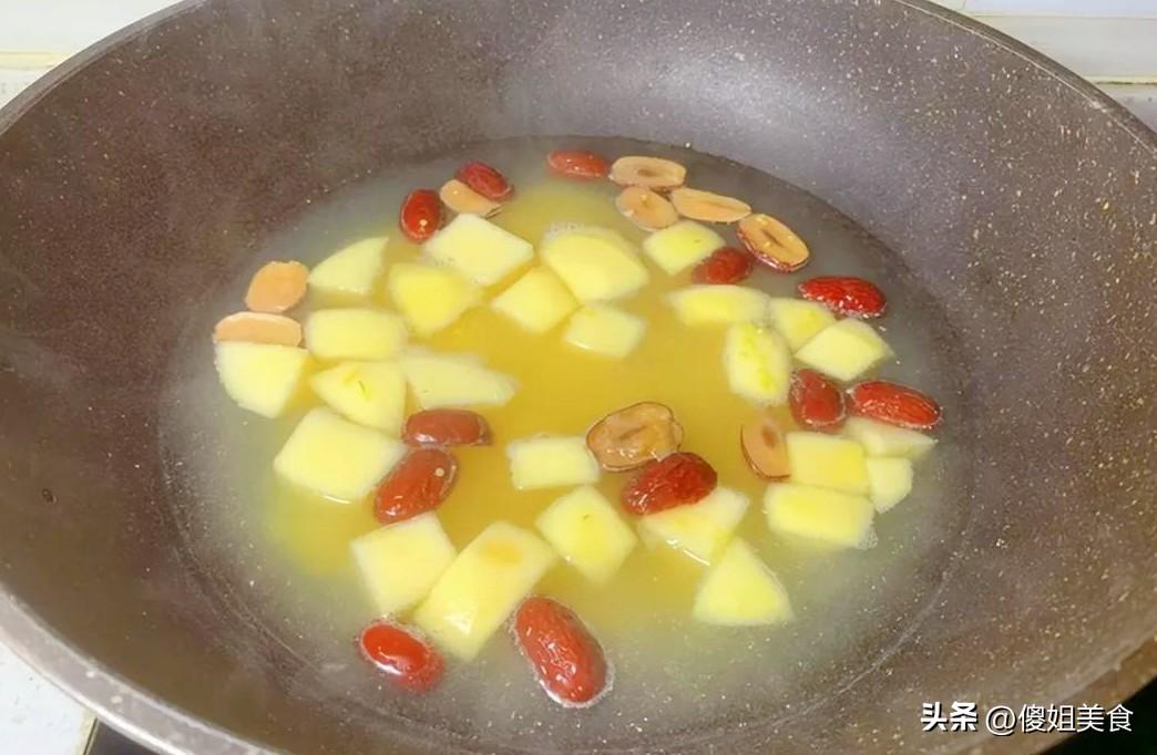 小米下鍋後,用勺子輕輕推幾下,防止粘底,再次煮開後,轉成中小火,煮個10分鐘左右,把蘋果塊和紅棗扔進去讓它慢慢地咕嘟着。