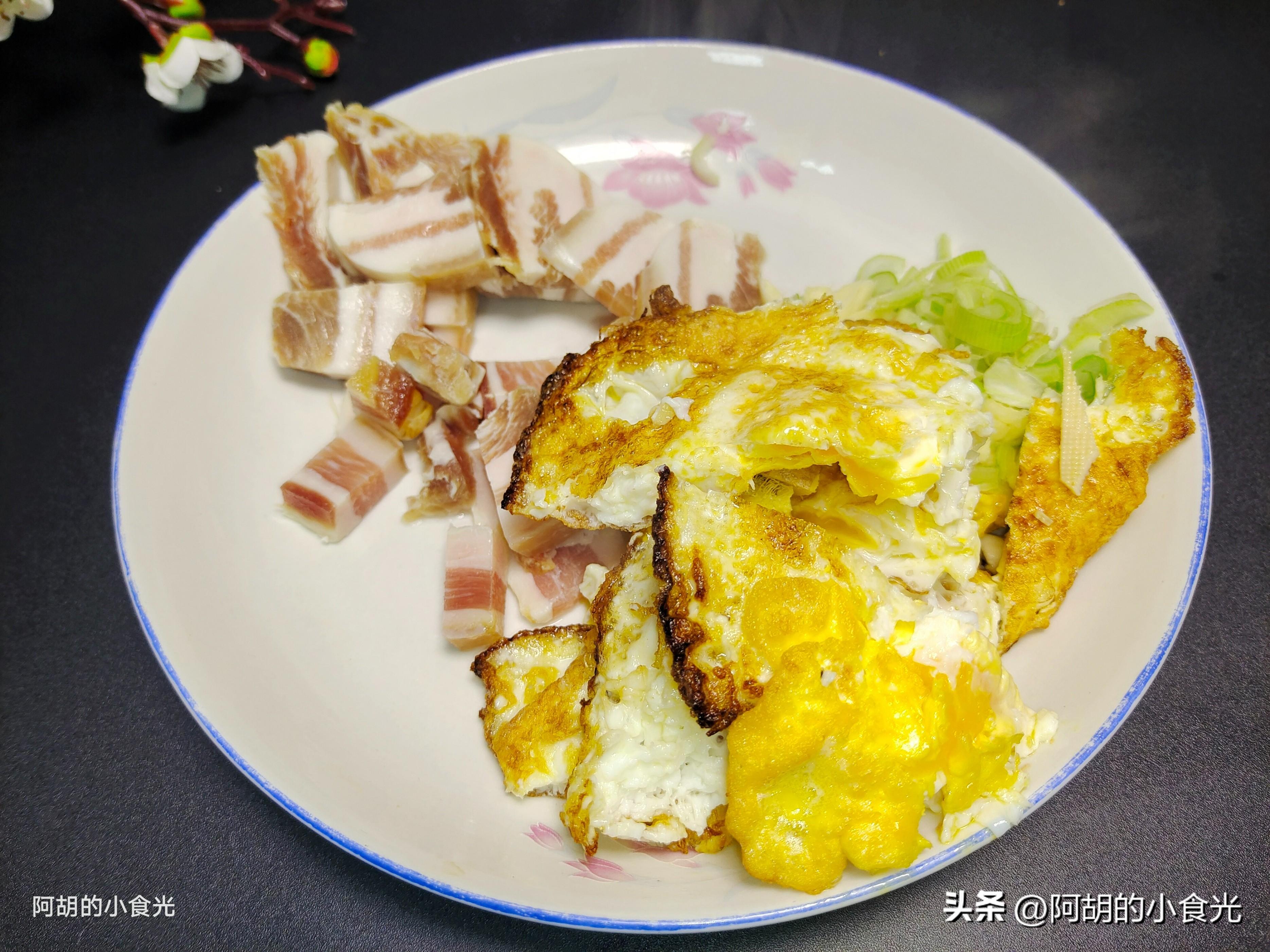 第三步:和平菇搭配的配菜有用三個雞蛋煎好的荷包蛋,煎好後最好切塊備用。還有鹹肉一小塊切片備用。一棵青菜洗淨後待用。再來一些蔥蒜切碎作爲小料使用,喜歡一些辣味的可以在小料中稍微添入幾個紅幹椒節。
