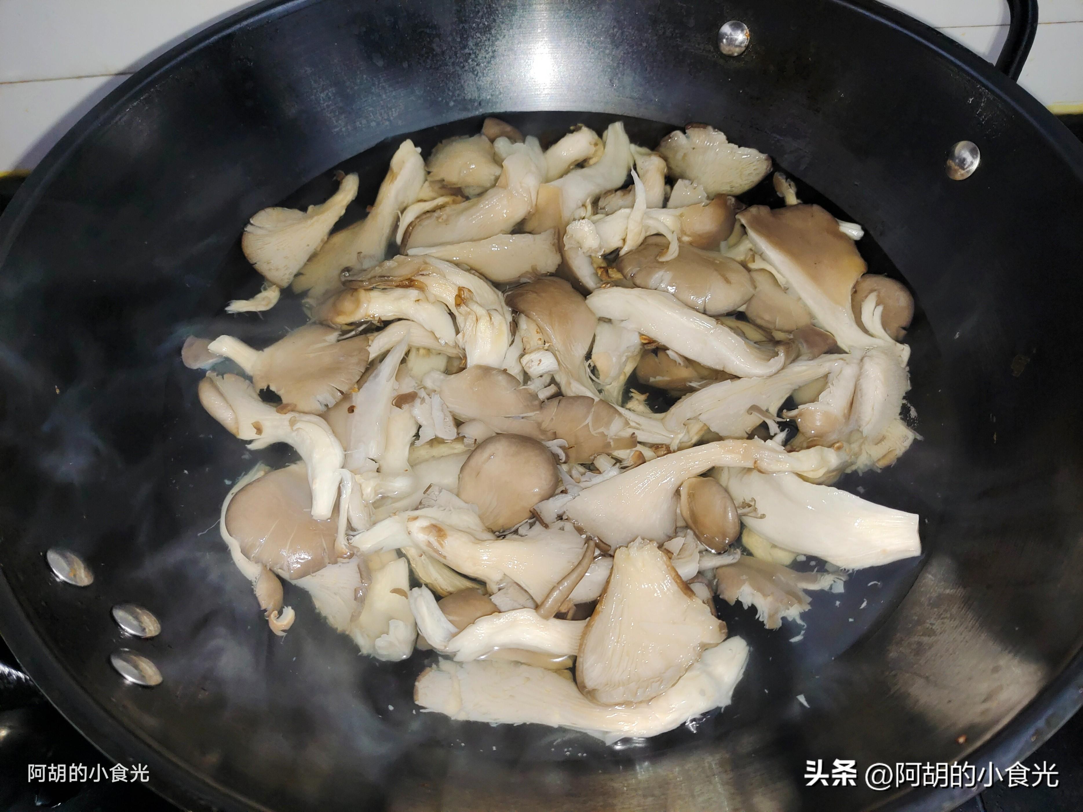 第二步:鍋裏燒一些開水,保持大火把平菇倒入開水鍋中焯燙一下,幫助去除平菇帶有的一些土腥味,撈出後用涼水衝一衝再擠幹水分待用。