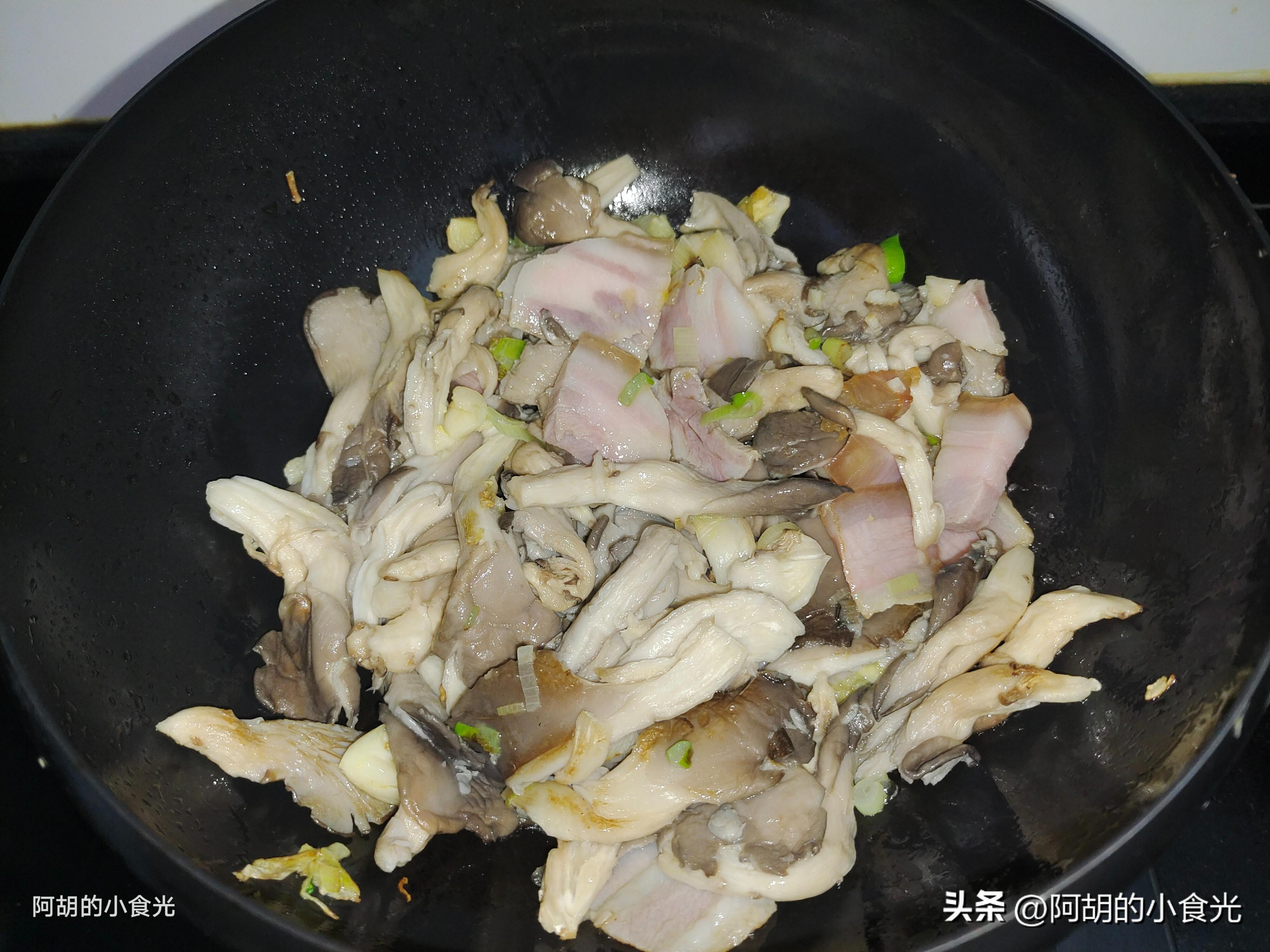 第四步:所有食材和輔料都備好後就可以開火烹飪了。先把鍋烘乾,淋入一些菜籽油燒熱,再把鹹肉片倒入鍋中小火煎炒一下,至變色出香味後下入蔥蒜炒出香味,而後再把平菇倒入鍋中,轉爲最大火炒一炒,炒去一些水分激發出食材的鮮香味。