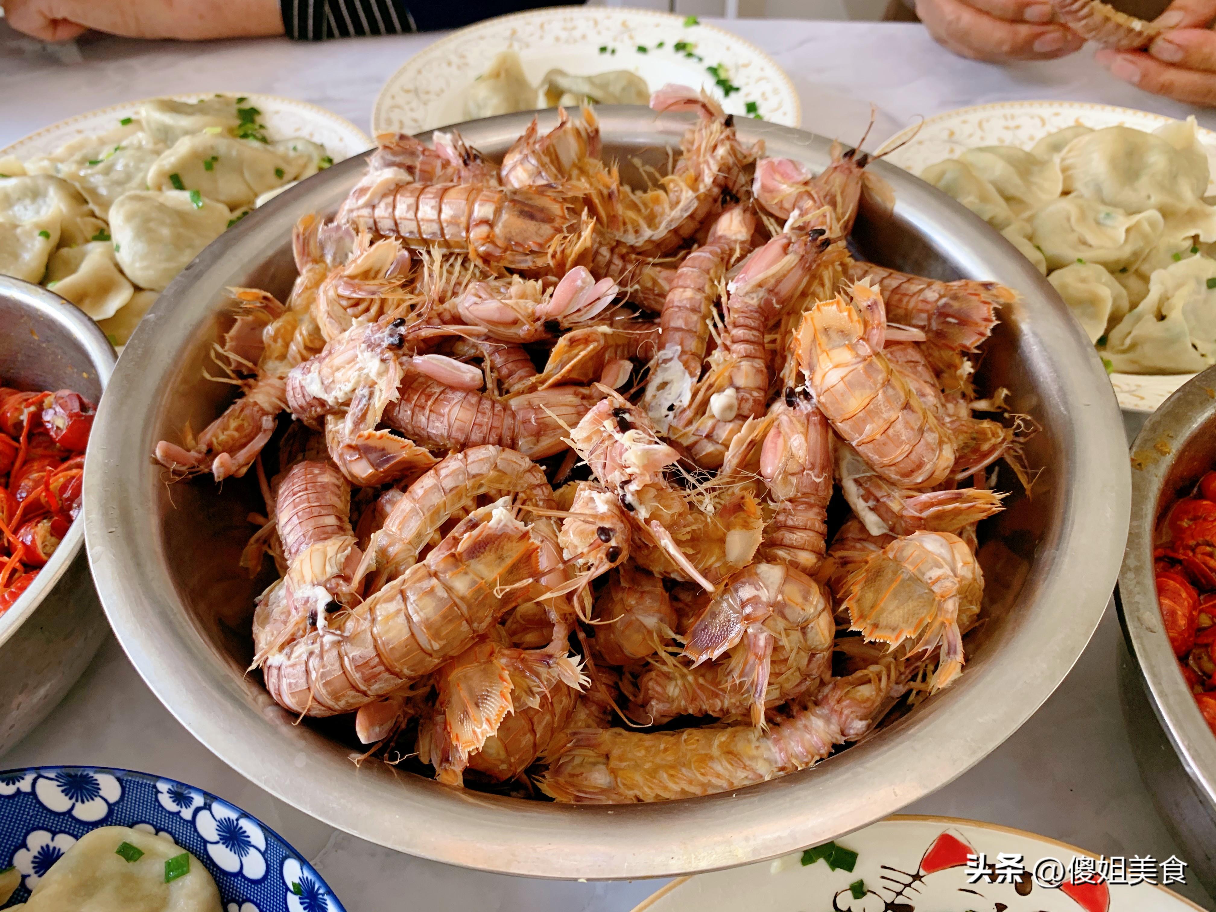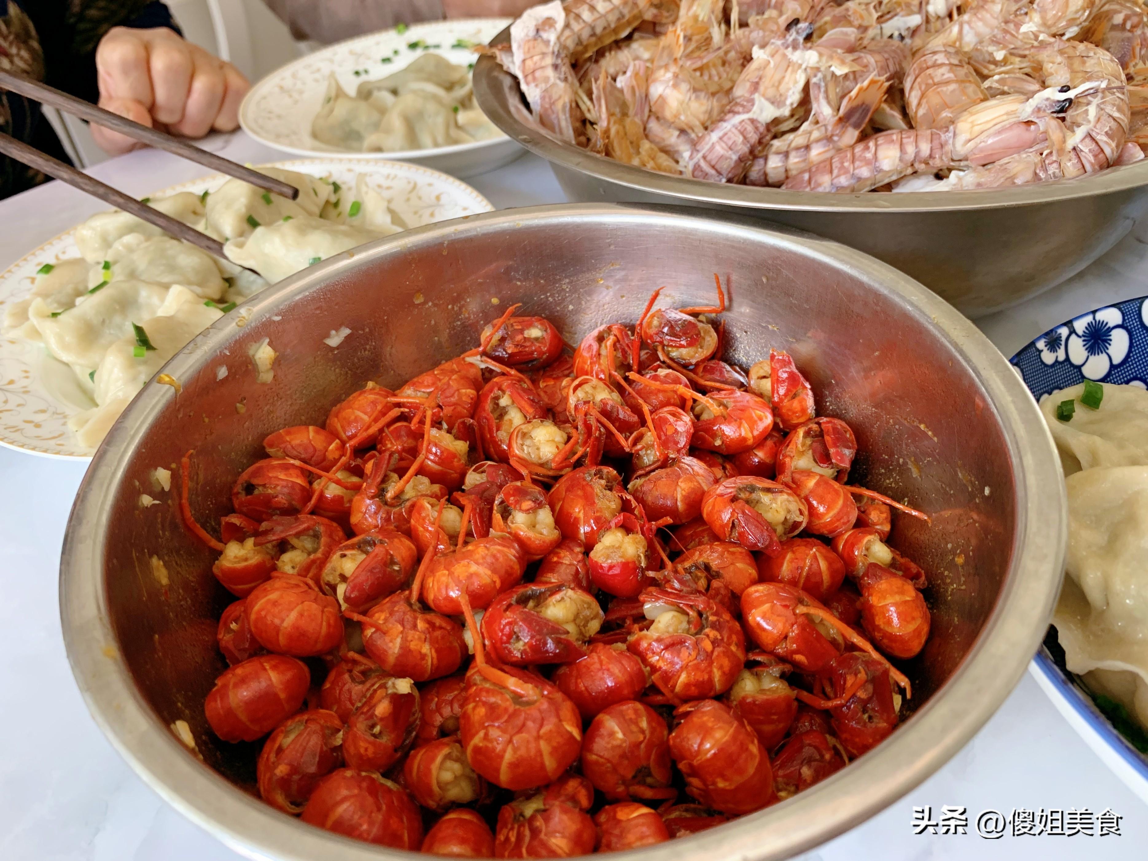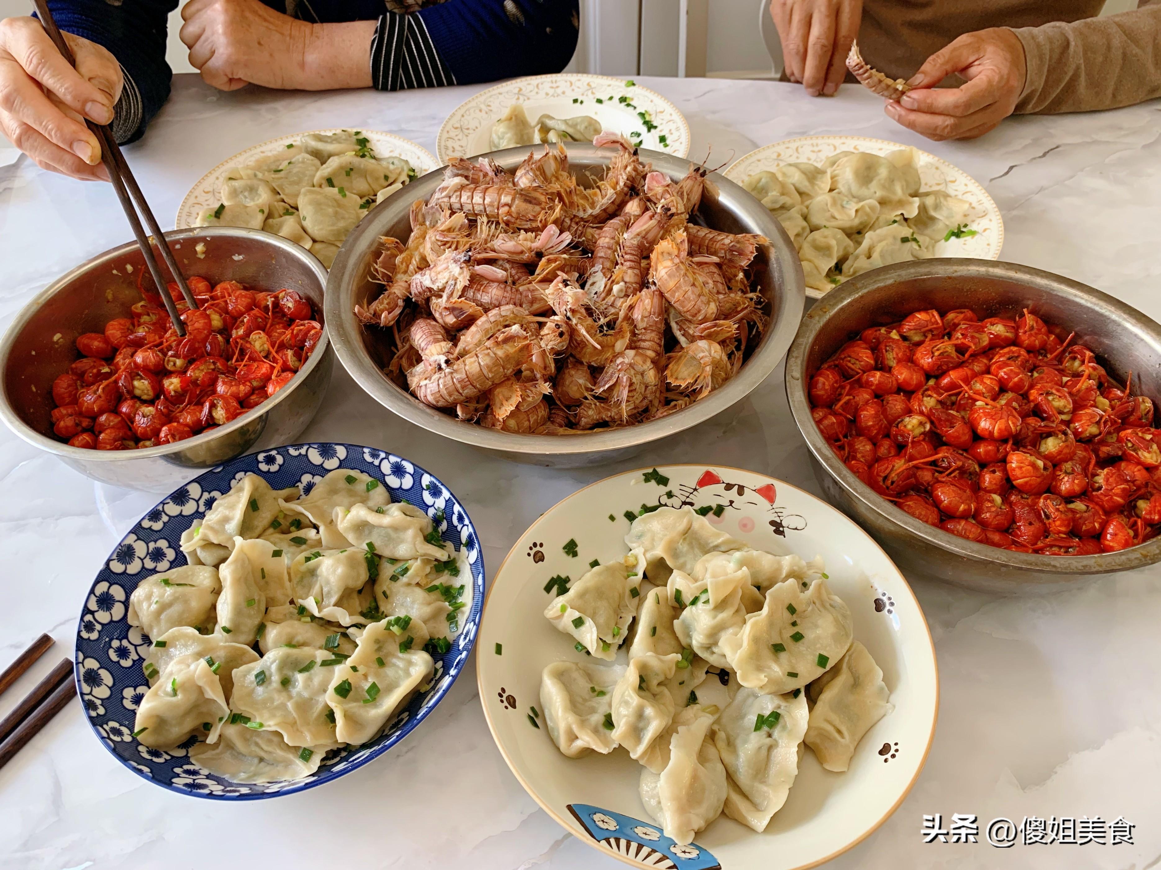 就這樣,一鍋餃子,一盆皮皮蝦,兩大盆麻辣龍蝦尾,再加上幾瓣蒜、一小碗醋,一頓豐盛又家常的午餐就齊活了。五口人圍坐一桌,說說笑笑,孩子搶着喫龍蝦,老人慢慢剝着皮皮蝦,我和愛人邊喫餃子邊聊着天。