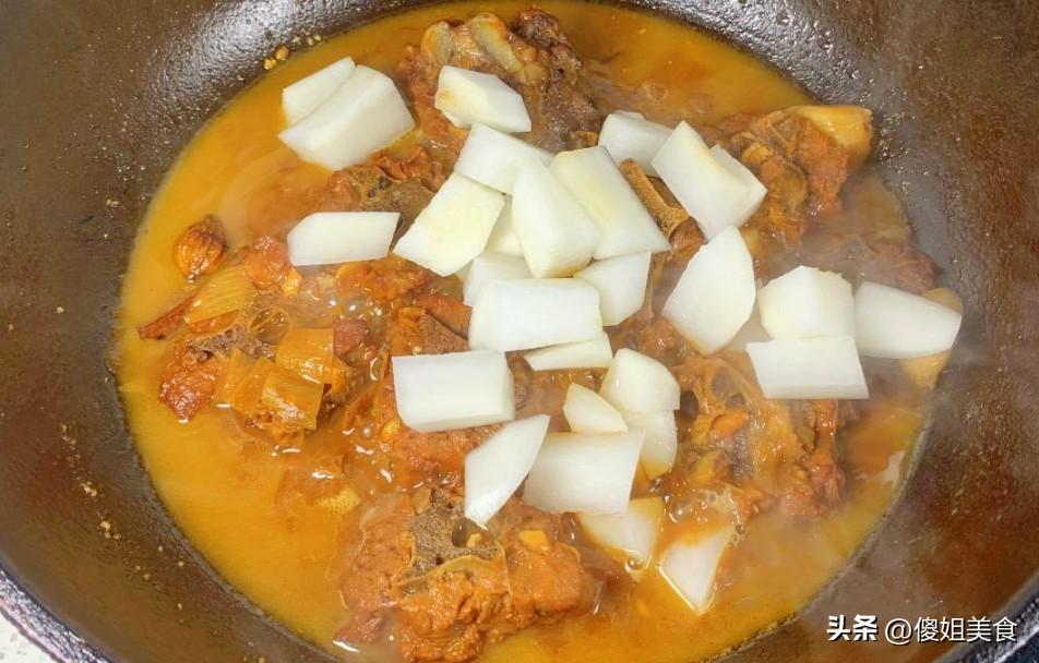 第五步:一個小時到了,打開鍋蓋,香味已經非常濃郁了。把切好的白蘿蔔塊,全部推進鍋裏,用勺子往下按按,讓它們儘量浸到湯汁裏。根據情況,可以再加一點開水,確保湯汁能基本覆蓋食材。重新蓋上蓋,繼續中小火,再燉30-40分鐘。