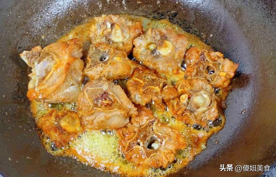趕緊拿起鍋鏟,快速翻炒,讓每一塊羊蠍子都均勻地裹上糖色。看,就這麼一會兒,骨頭已經披上了一層紅潤油亮的外衣,好看極了。這一步不僅能讓成品顏色誘人,還能增加一種複合的香味。