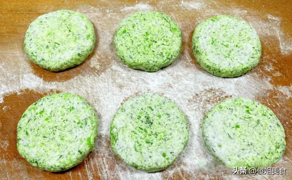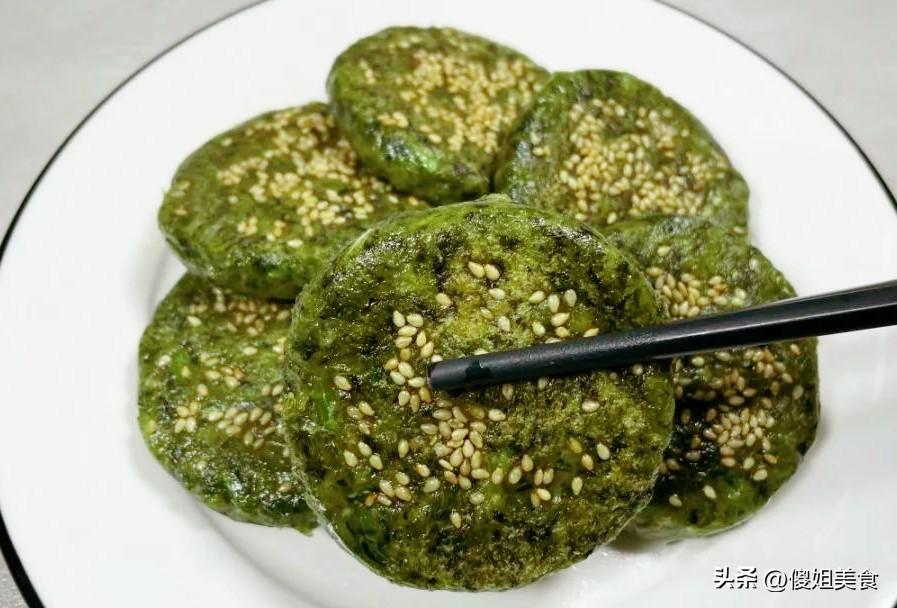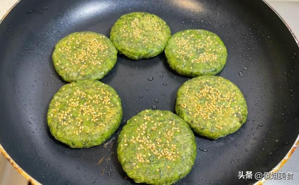 煎到兩面金黃,用鏟子按壓餅身能迅速回彈,就說明熟透了。這時候的茼蒿糯米餅外皮有點焦脆,內裏卻是軟軟糯糯的,特別好喫。