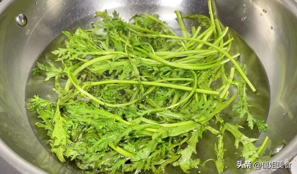 【做法】1、洗好的茼蒿需要焯一下水。燒一鍋開水,加一小勺鹽和幾滴油(這樣能讓茼蒿保持翠綠),然後把茼蒿放進去燙30秒左右。看到茼蒿變軟、顏色變得更綠了,就立刻撈出來,放進冷水裏過涼。過涼後的茼蒿擠幹水分,放在案板上切成細末。這時候茼蒿的香味就散發出來了,特別好聞。