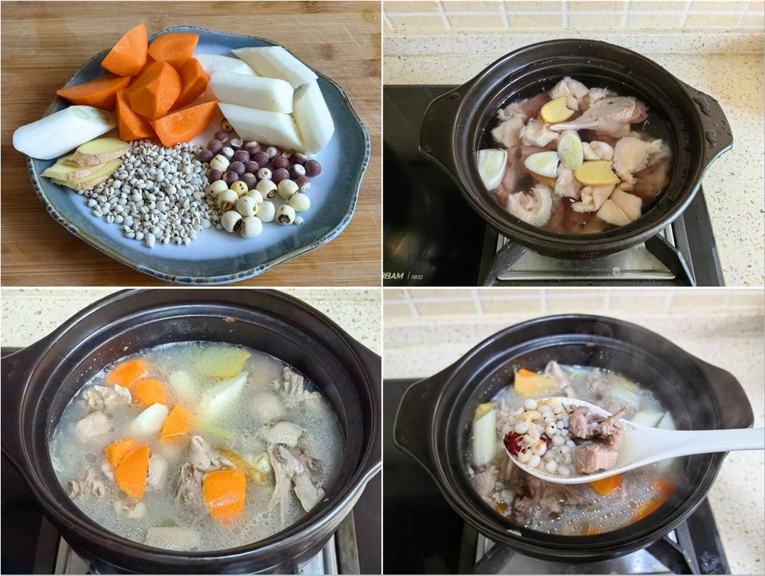 1. 薏米、芡實、蓮子提前用清水浸泡1小時。老鴨切塊,冷水下鍋,加幾片姜和一點料酒,煮開焯去血沫,撈出洗淨。山藥和胡蘿蔔去皮,切滾刀塊(處理山藥時記得戴手套,以防手癢)。