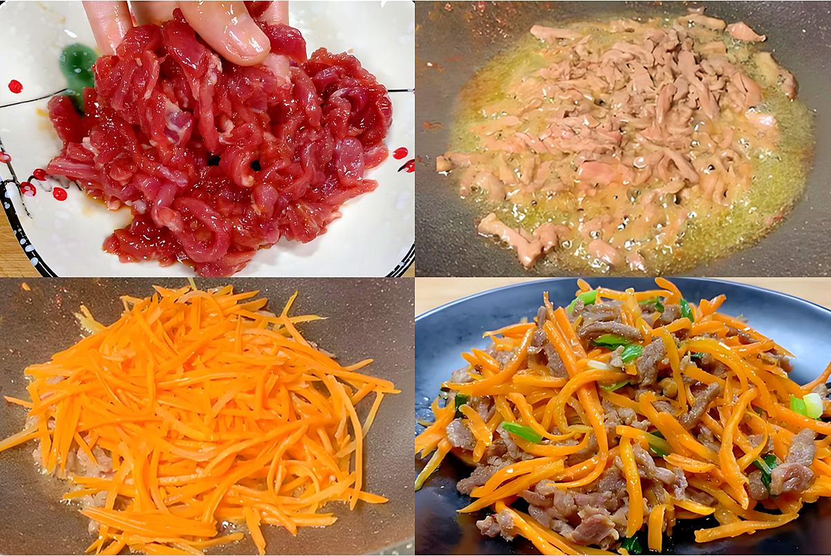 這是一道典型的家常快手菜,葷素搭配,營養均衡。胡蘿蔔的甜脆中和了牛肉的厚重,口感豐富,非常下飯。