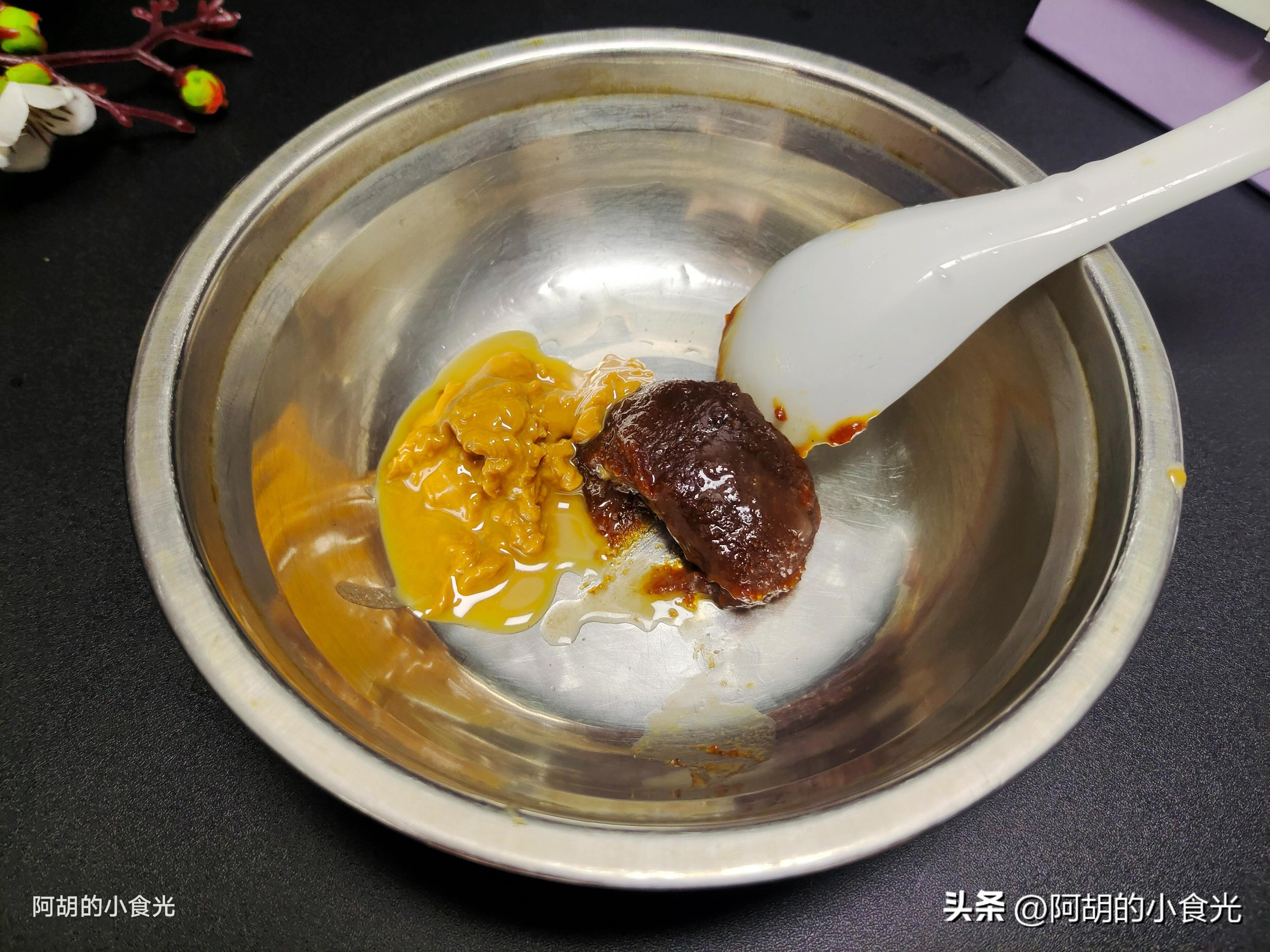 第二步:製作這道菜最好再加入一些粉絲來豐富口感和味道,就挑選比較纖細的龍口粉絲,用溫水泡軟後待用。還需要兩種“醬料”來搭配提味,一個是沙茶醬一湯匙,另一個就是花生醬一湯匙。