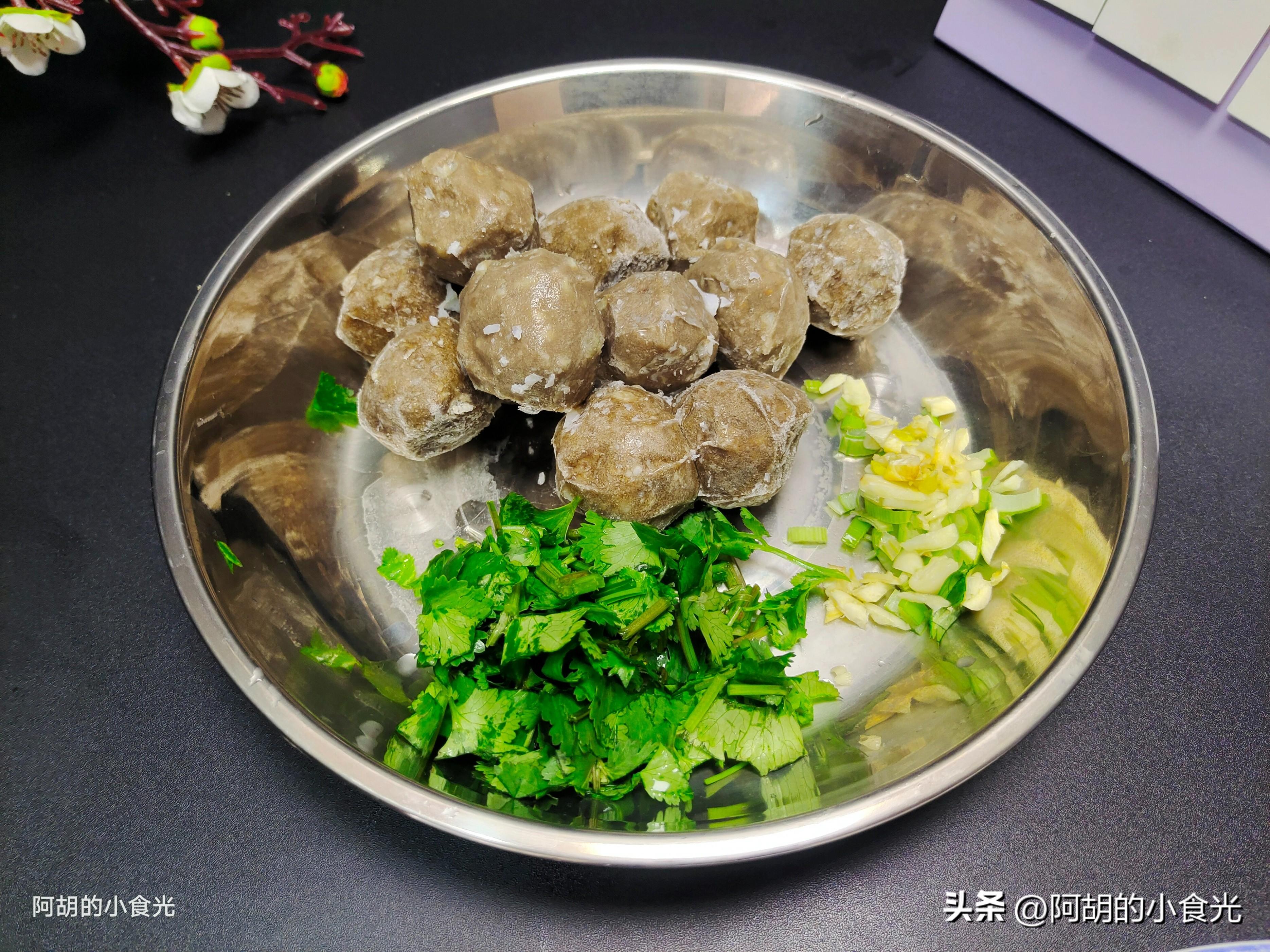 第一步:先來準備今天主要的食材,一個就是牛肉丸,一定要挑選純牛肉丸,取出解凍後待用,其實不用解凍也可以直接下鍋的。而後再準備一把香菜和香蔥切碎後待用,還有一些蔥蒜作爲小料使用。還有一個重要食材就是白蘿蔔,洗淨去皮後切成滾刀塊備用,此處有不喜歡蘿蔔臭味的可以倒入開水鍋中焯燙兩分鐘,撈出後涼水衝一衝待用。
