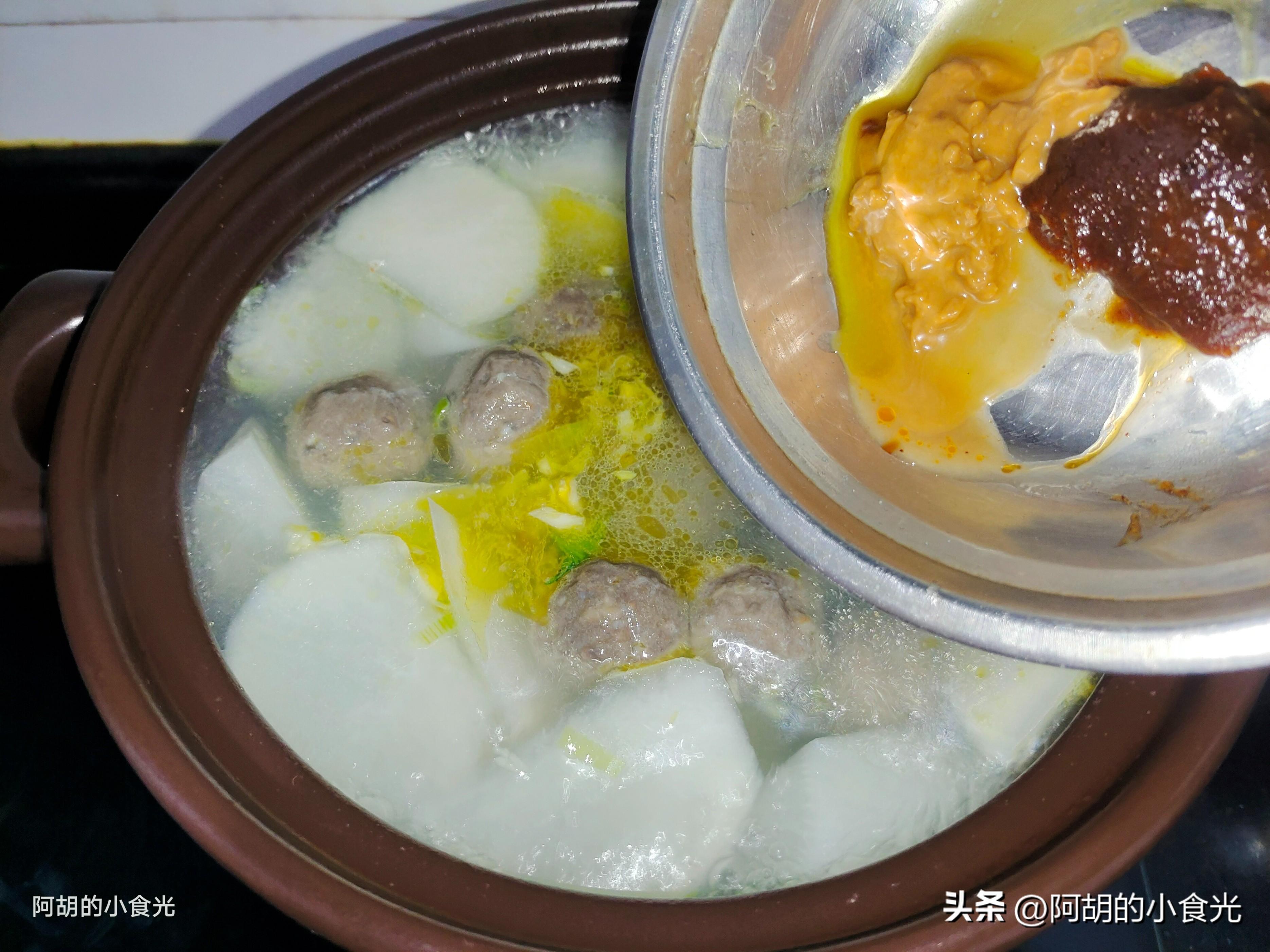 第四步:準備一些開水直接衝入鍋中,把牛肉丸也倒入鍋中,轉爲最大火煮開,將備好的兩種醬料都倒入湯汁中,而後加蓋保持大火燉個十分鐘左右,讓蘿蔔充分熟透口感軟嫩的程度即可。