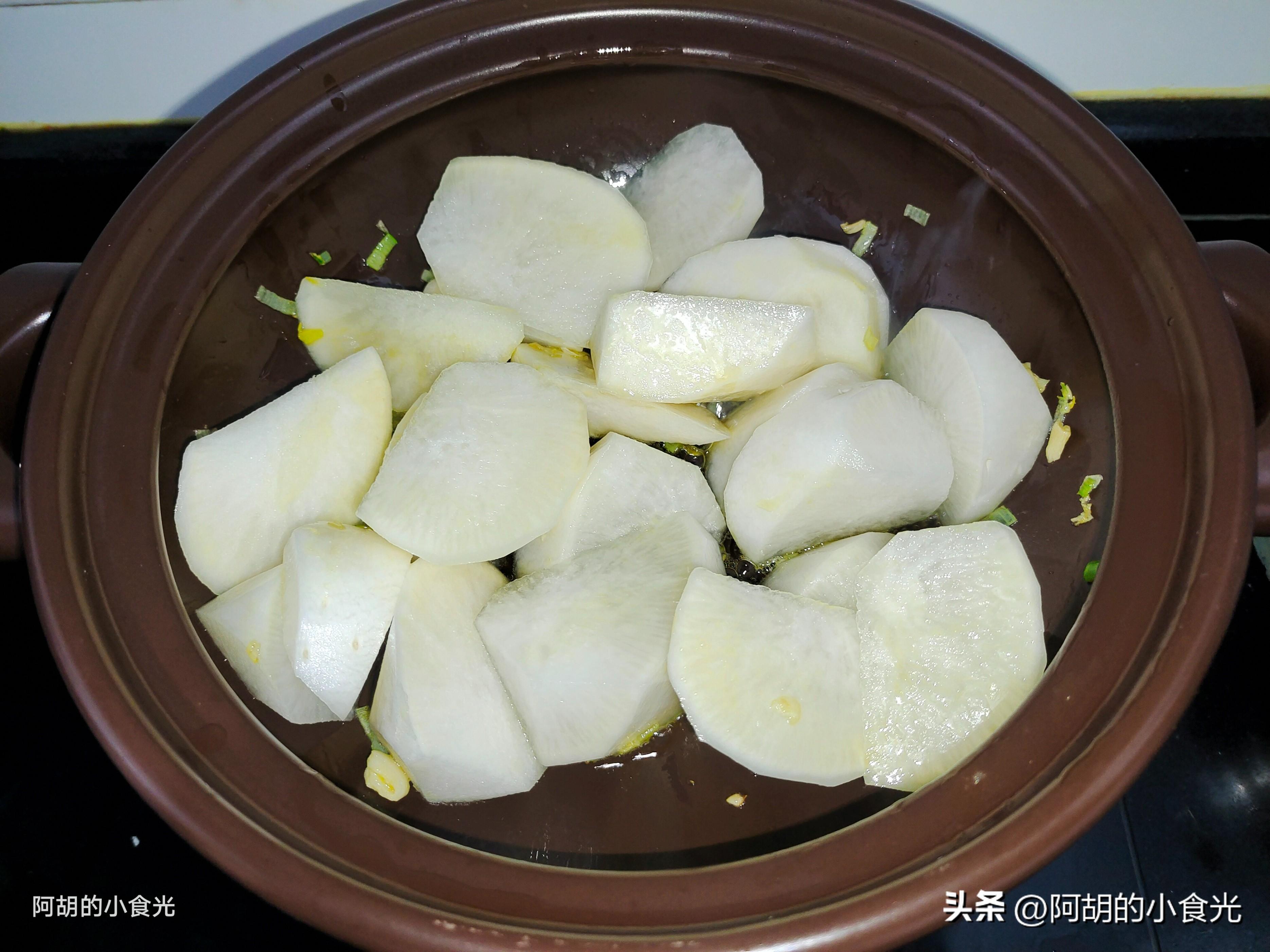 第三步:食材準備完畢後就可以開火烹飪了。這道菜是全程在砂鍋中操作的,先小火把砂鍋烘乾燒熱,淋入一些食用油後燒熱,把蔥蒜下鍋炒出香味,再把蘿蔔塊也倒入鍋中,簡單翻炒翻炒。