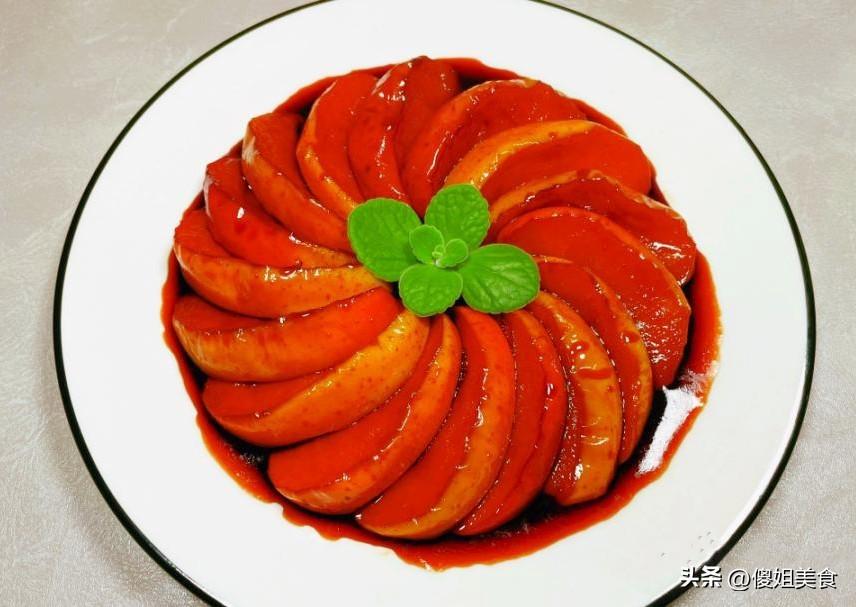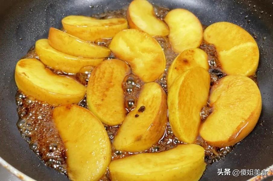 第五步:看到汁液變得濃稠,能掛在蘋果上時,就大功告成了。關火,裝盤。那色澤,那香氣,絕對能讓你口水直流。