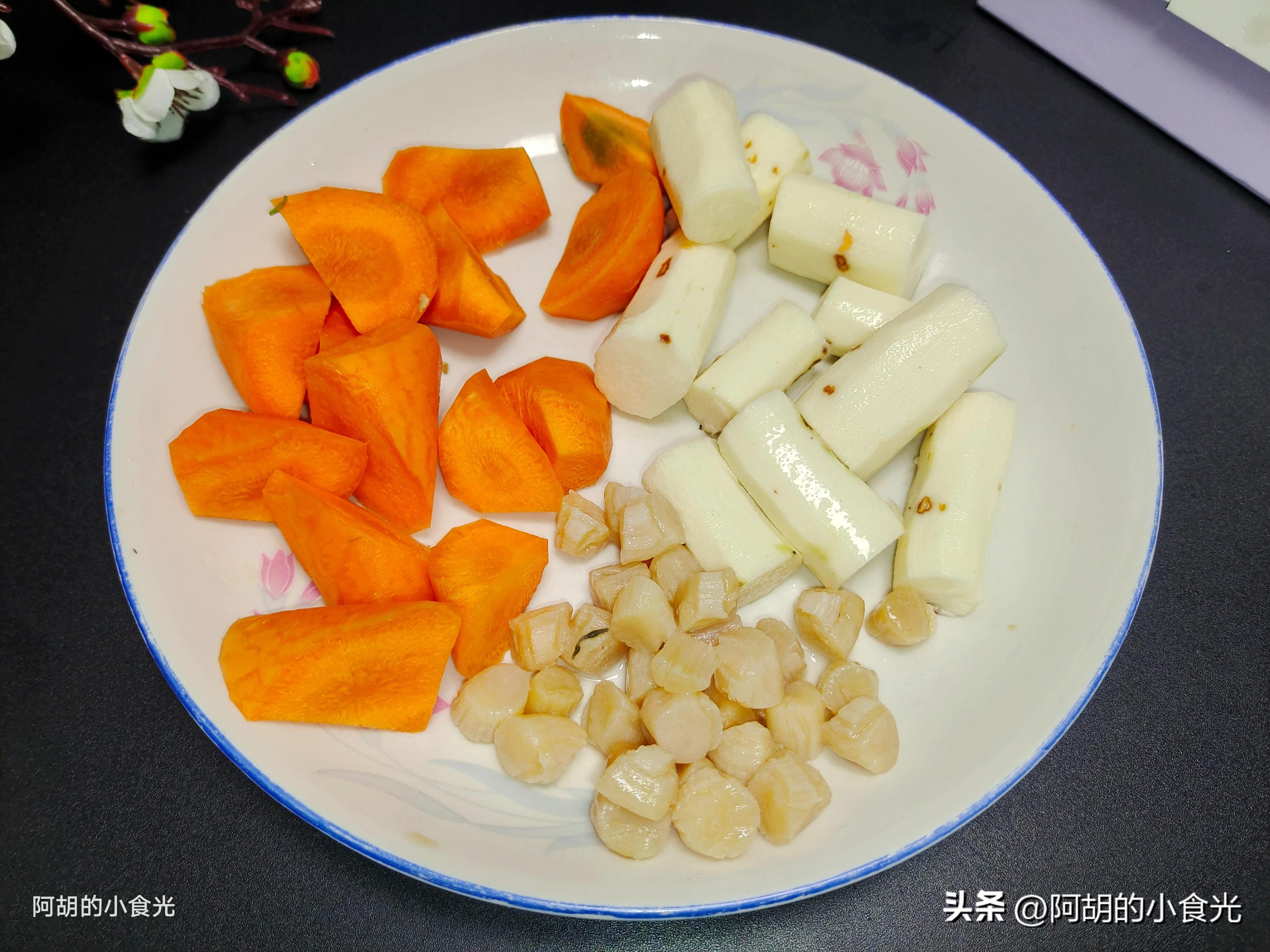 第二步:再來把主要的配菜準備好,首先是山藥,兩根就可以,直接削掉外皮後切成小段備用,過程中要小心一些,避免山藥粘液沾染皮膚。而後是一個胡蘿蔔去皮後切成滾刀塊備用。還有一個最重要的一小把乾貝用涼水浸泡半個小時備用。