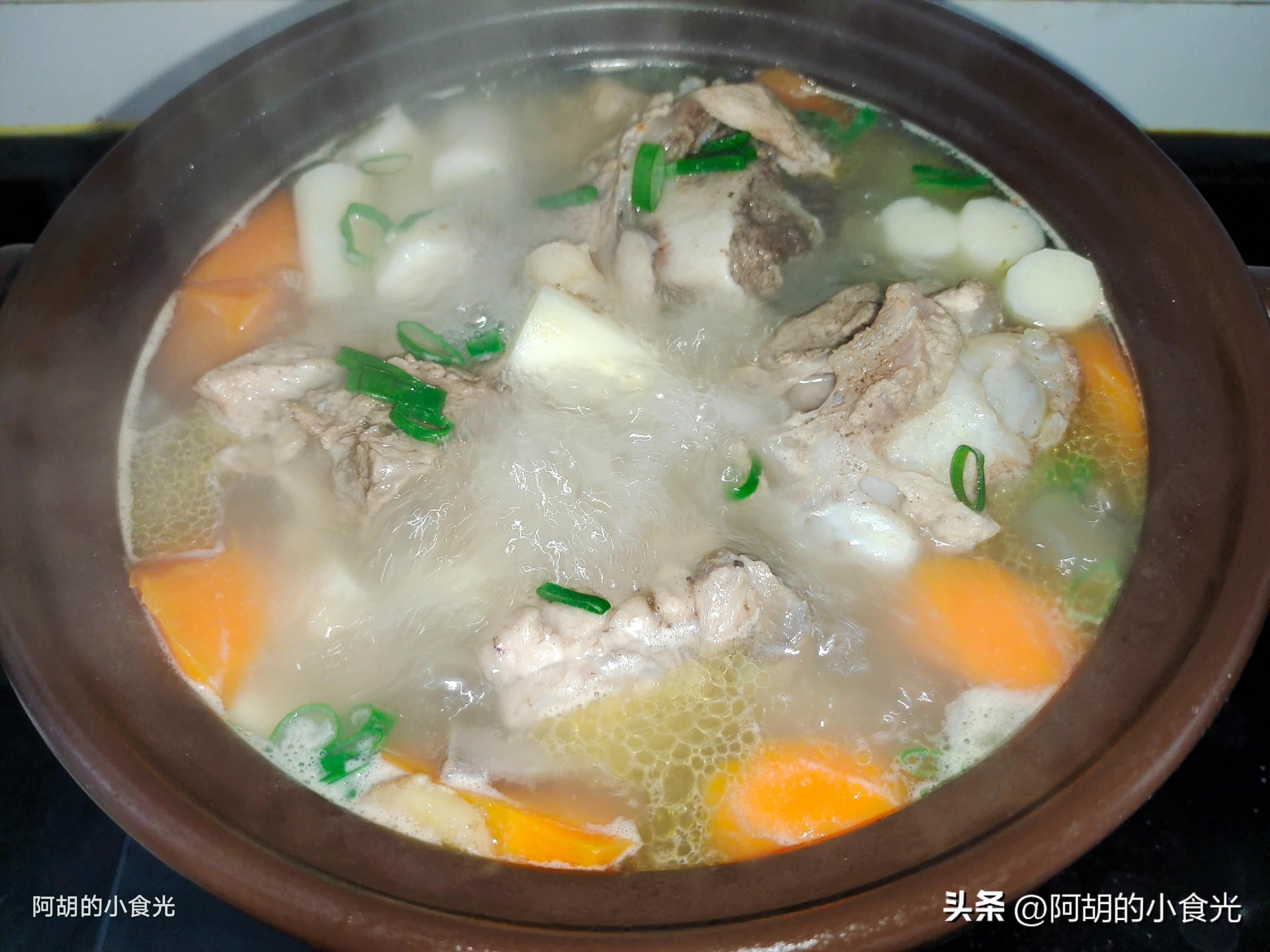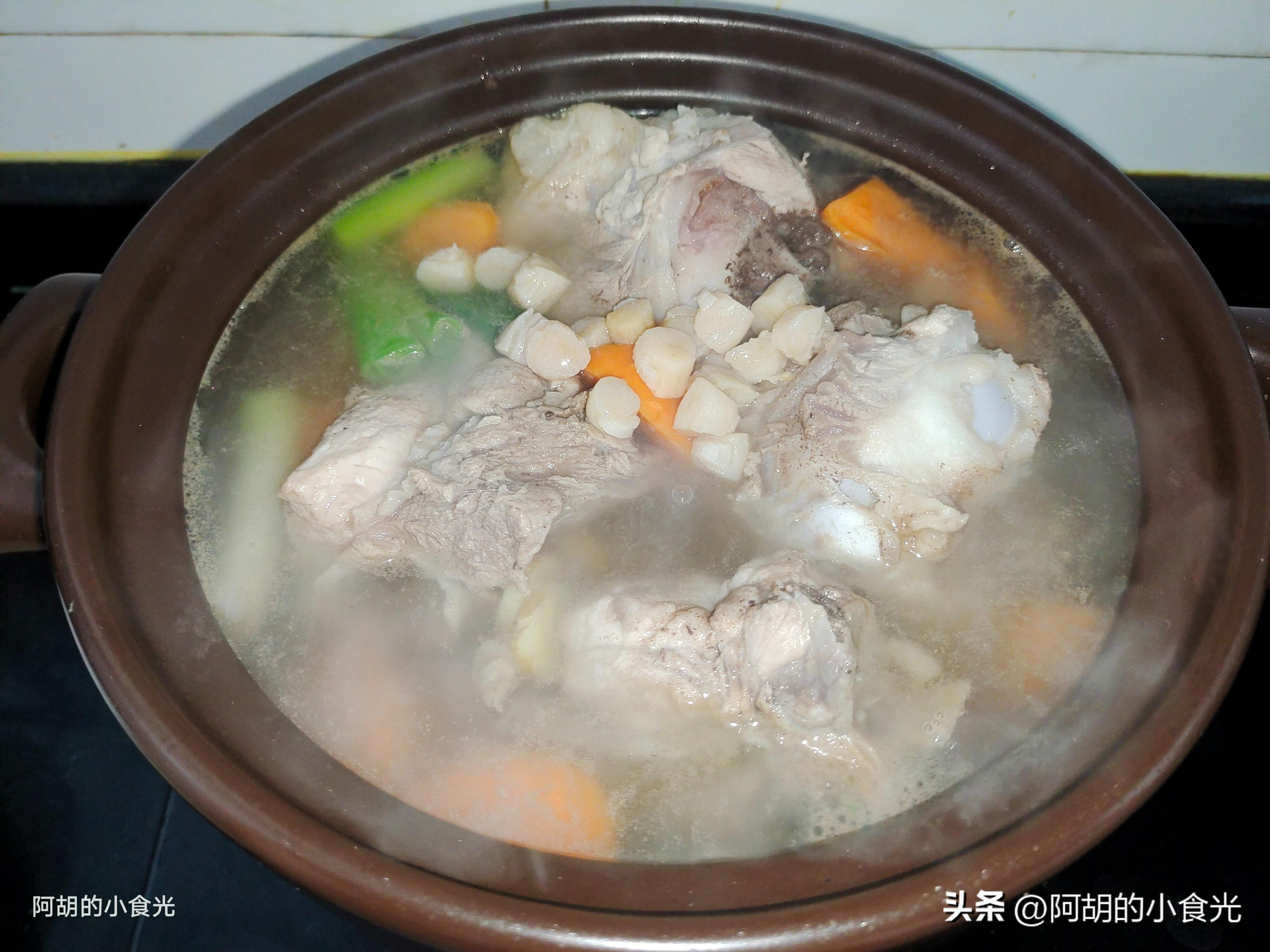 第五步:時間到後開蓋撒入一把蔥花點綴提味,再根據自己的口味對湯水的調味略作一些調整後就可以出鍋上桌了。開蓋就是淡淡的海鮮清香味,這個味道主要就是來自於乾貝的作用,再嘗一口湯,絕對的鮮爽開胃,山藥和胡蘿蔔的口感都很綿軟,豬骨的肉質也是恰到好處,一口肉一口湯,別提有多舒爽了,感興趣的一定要試一試這道湯的做法。