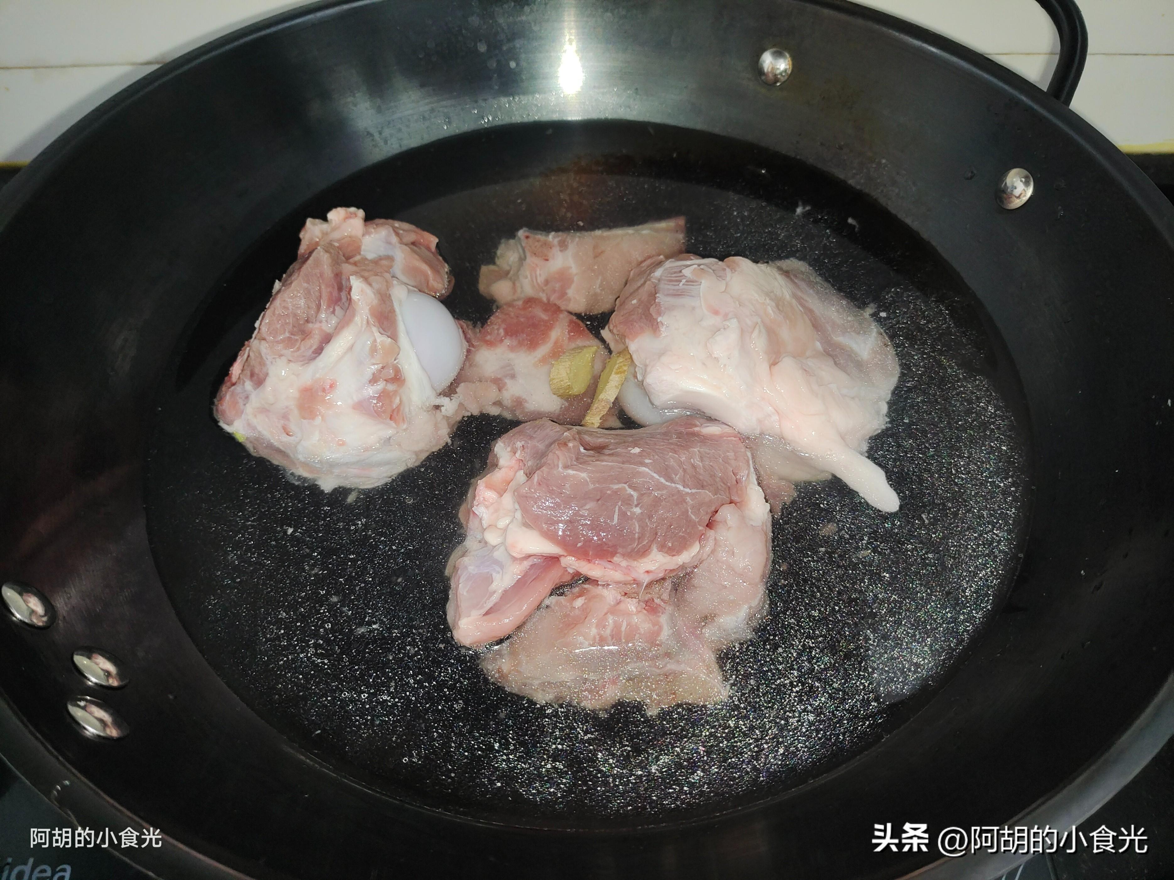 第一步:先挑選一個新鮮的豬筒子骨,可以請賣肉的老闆將其剁開成三段,拿回家後先用涼水浸泡一個小時,幫助去除一些血水,而後再涼水下鍋加入一些料酒和薑片開大火焯水,保持大火煮個三五分鐘,時間到後再撈出用清水沖洗乾淨待用。