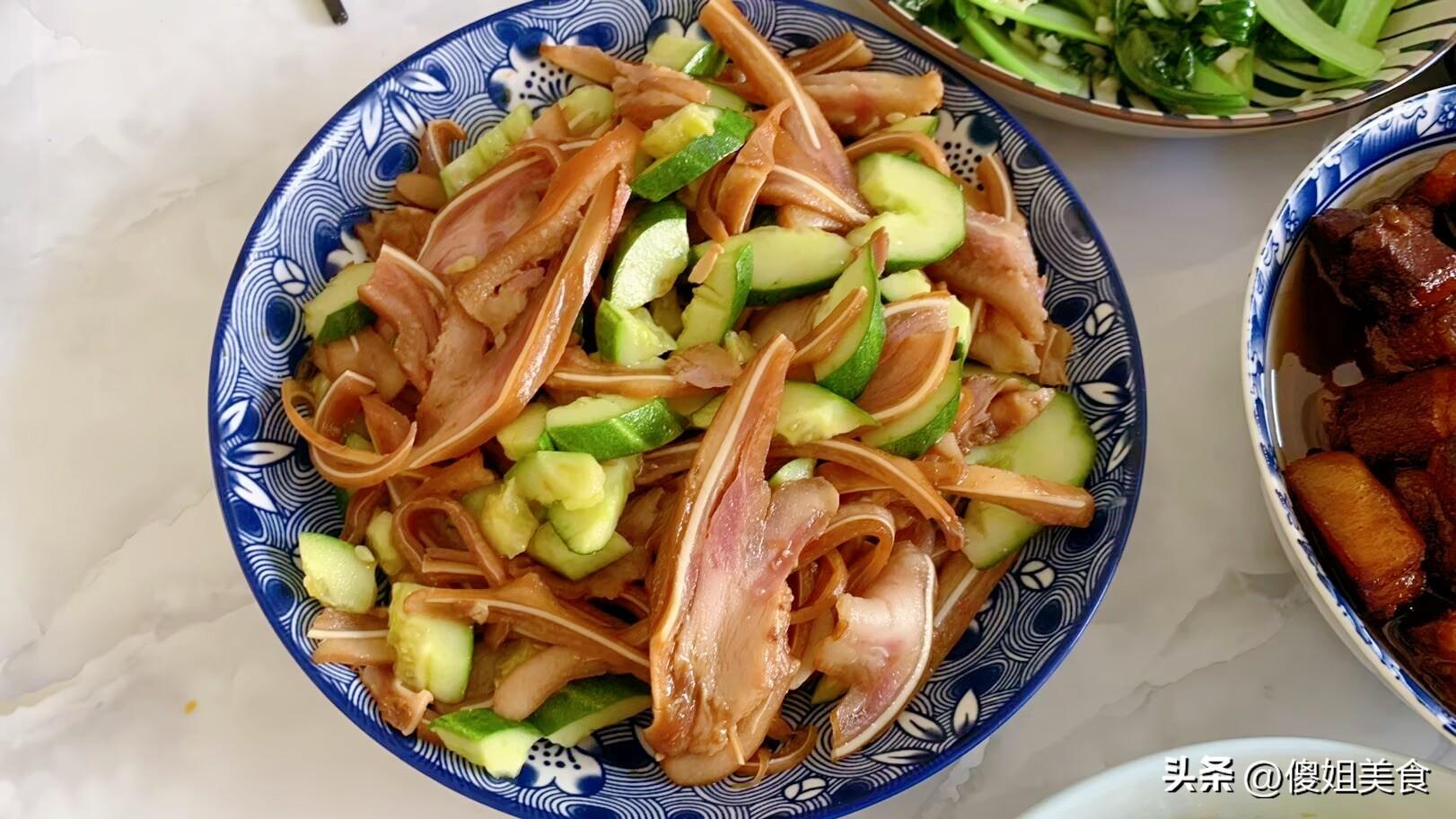 涼菜就拌個黃瓜豬耳朵吧。黃瓜拍碎切小塊,豬耳朵切條,倒上適量蒜泥,淋上生抽、香醋、香油,攪拌均勻就行了。這道涼菜爽口解膩,最適合配着大包子喫。
