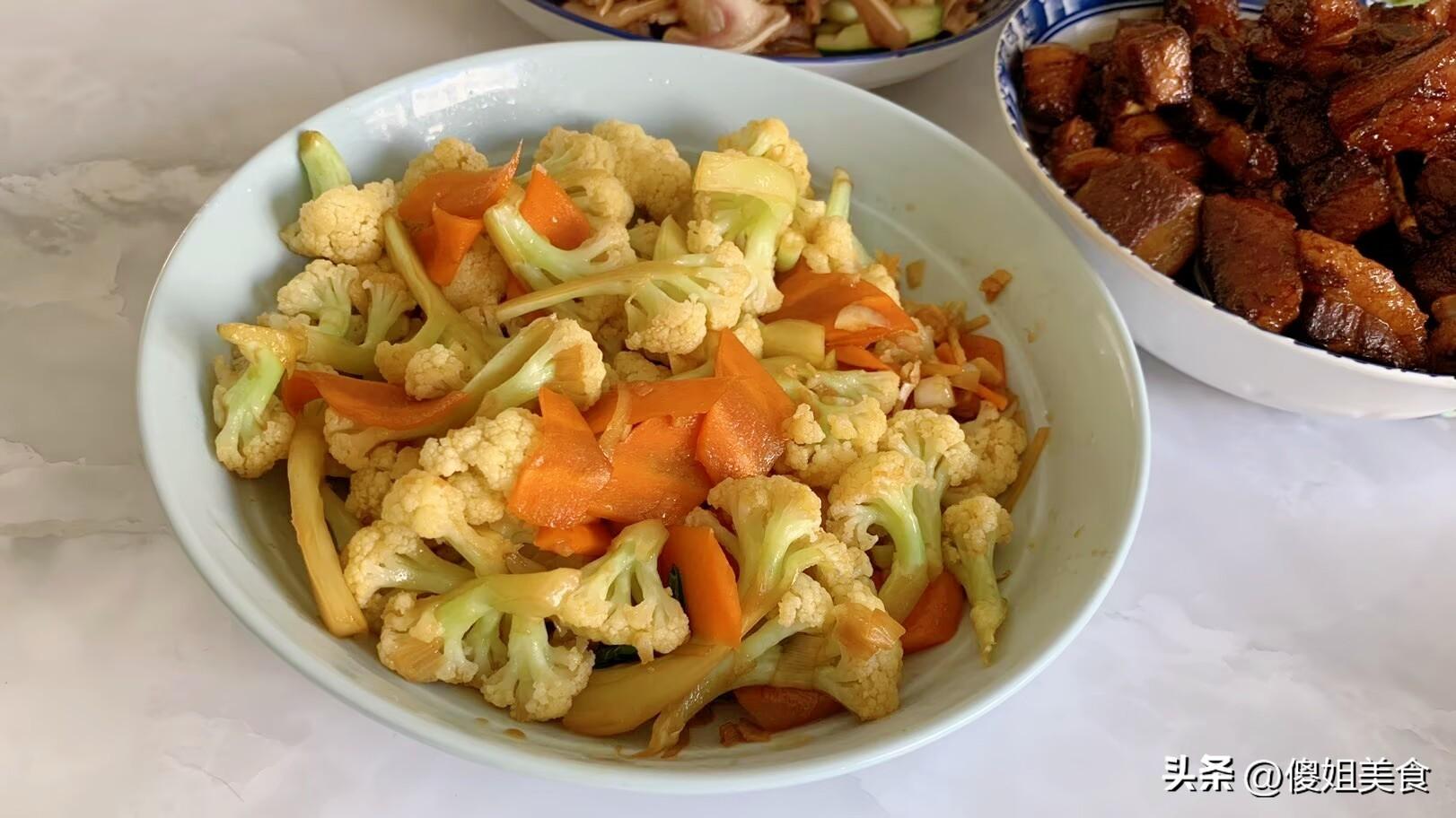 再來個素炒花菜,花菜掰成小朵焯個水,鍋裏放油,下花菜和胡蘿蔔片一起炒,加點生抽調味,最後勾個薄芡。胡蘿蔔的橙紅色配上花菜的乳白色,顏色好看又營養。