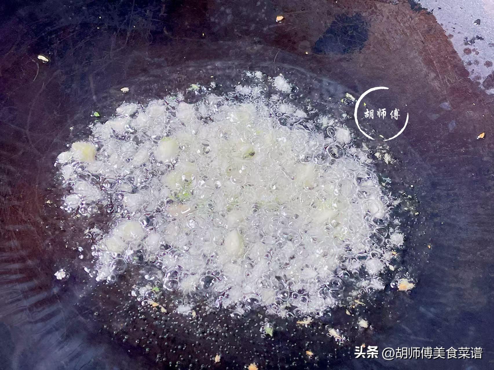 第四步:鍋中放入適量油,然後把切好的肥肉片放入鍋中,大火將肥肉煸炒成淺黃色後(不喜歡喫豬油渣的,可以把炸好的豬油渣撈出),再把蒜末放入鍋中,繼續炒七八下,充分激發出兒菜的香味。