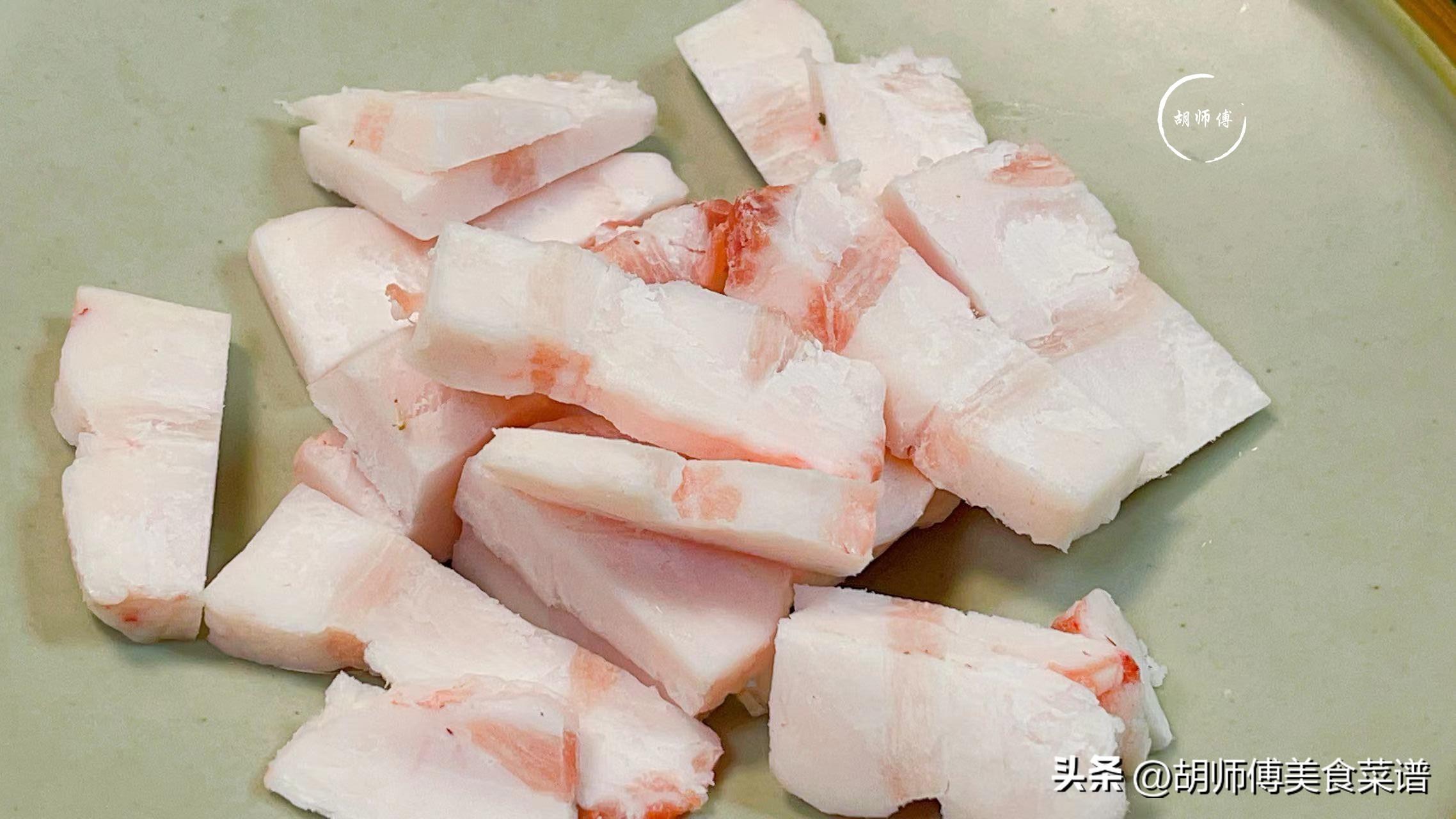 第二步:用溫水將肥肉沖洗乾淨,然後將肥肉切成薄片備用,喜歡喫辣的,可以切2個小米椒備用。