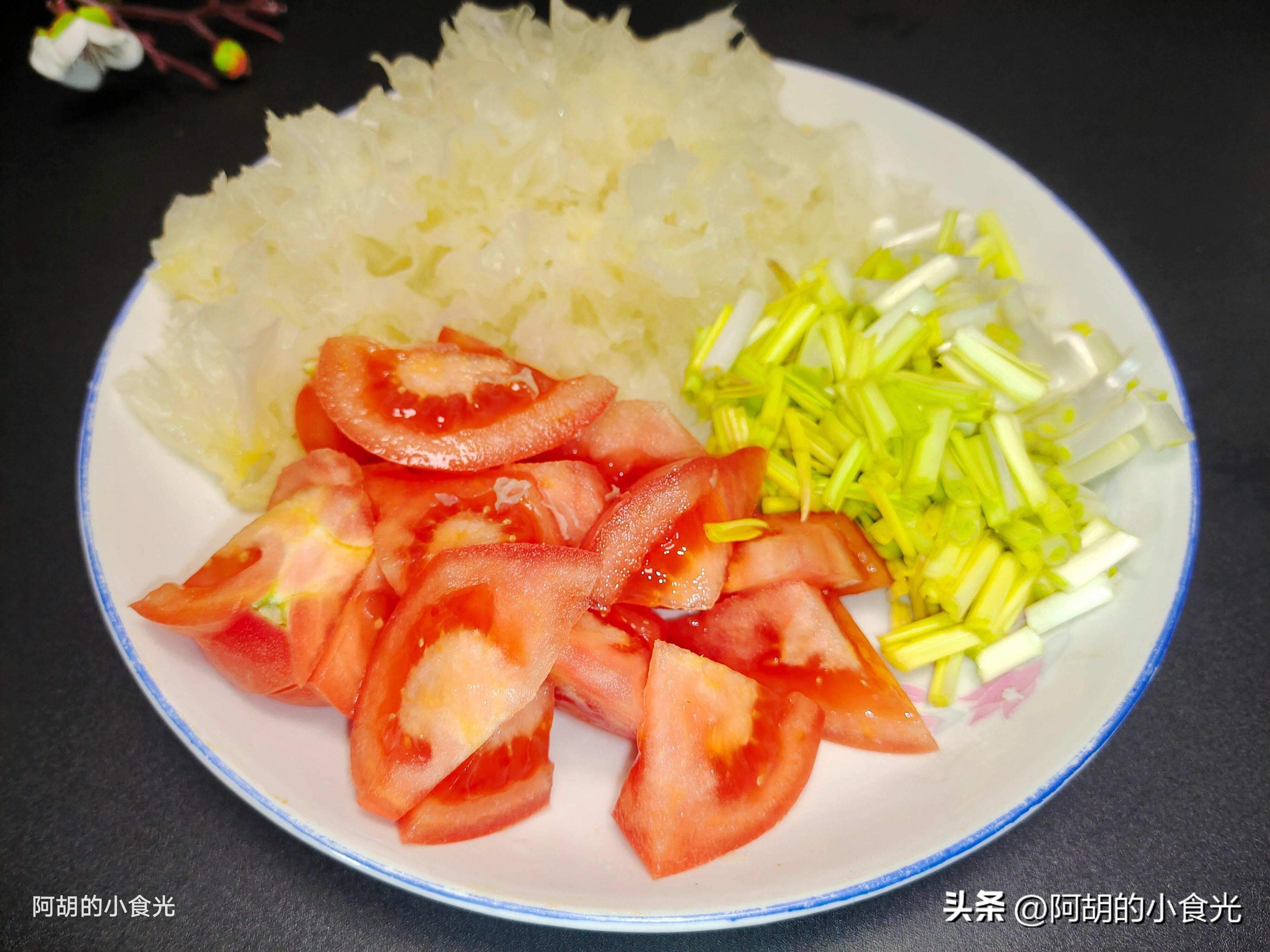 第一步:先來把主要的配菜都準備好,首先是銀耳一朵,用涼水浸泡一個小時左右,充分泡軟後再清洗乾淨,而後擠幹水分後將其撕開成小朵待用。再來一個西紅柿,洗淨後切塊備用。還有一把蒜黃,洗淨後切成小段待用。順便再準備一些蔥薑絲作爲小料使用。