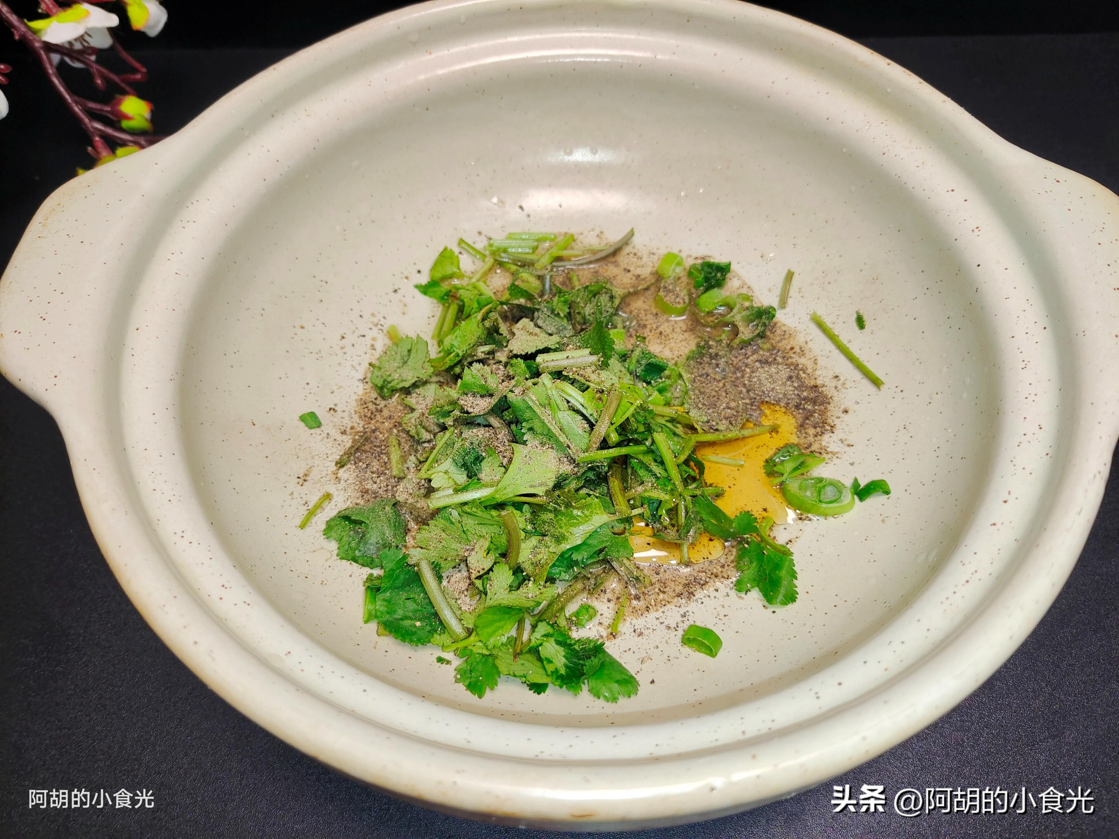 第二步:還有一個湯碗要備好,在湯碗中還要加入一把香菜碎,多一些的黑胡椒粉、白米醋和一湯匙的芝麻香油攪勻待用。