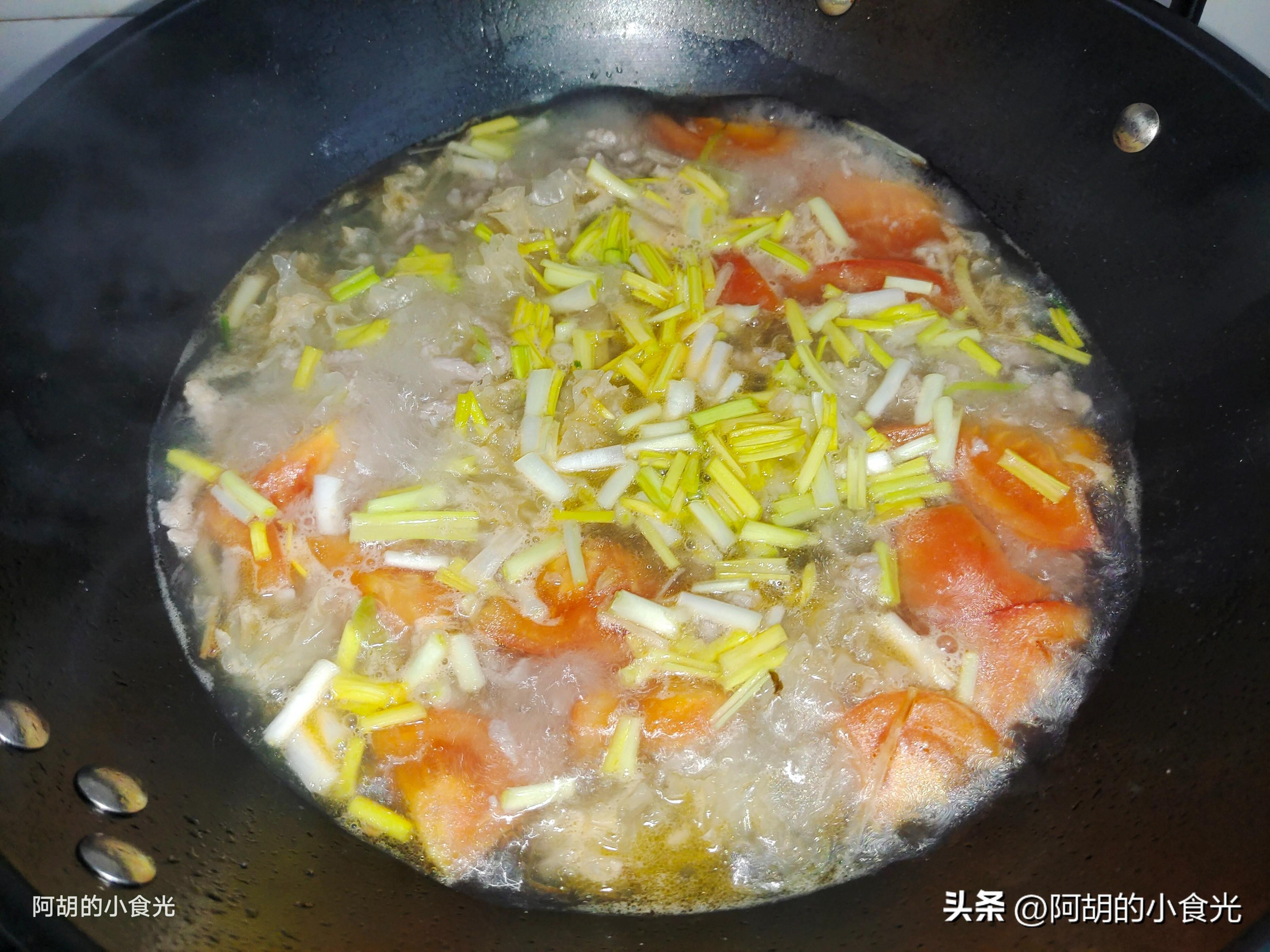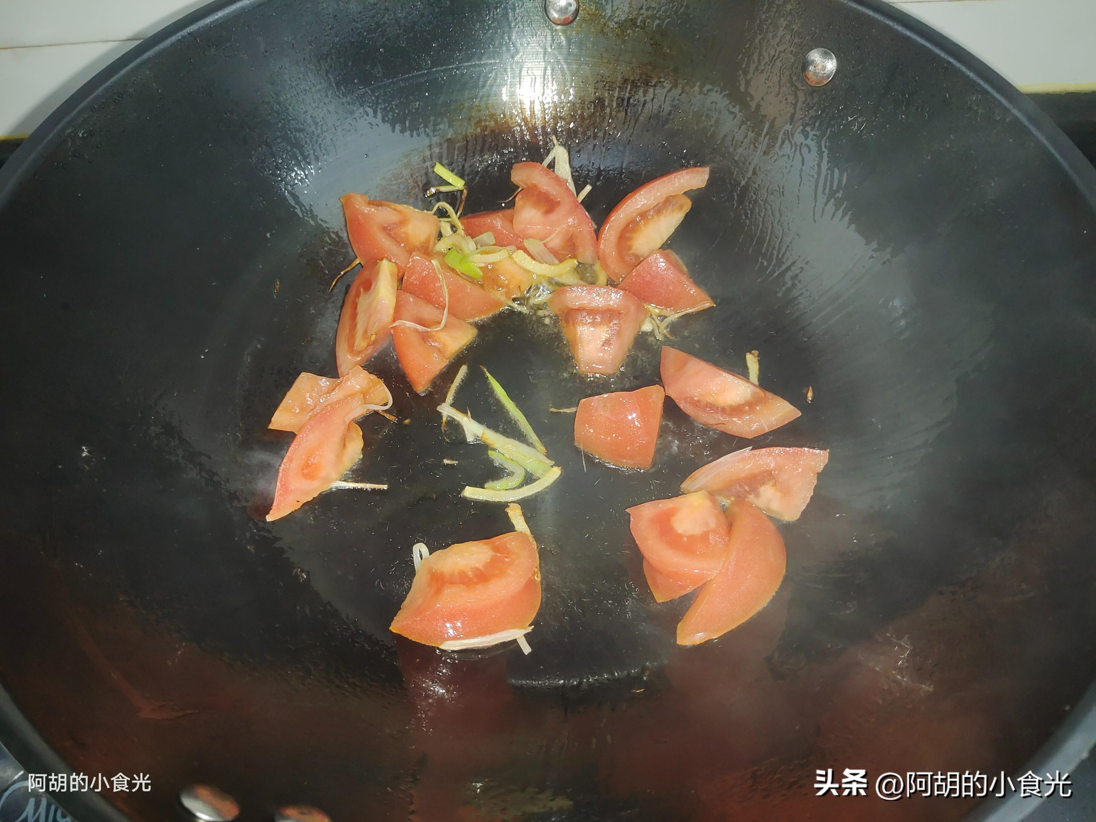 第五步:起鍋燒油,油熱後下入蔥薑絲炒出香味,接着把西紅柿塊丟入鍋中簡單翻炒翻炒。而後直接衝入開水適量,大火煮開後把銀耳也下入鍋中煮個兩三分鐘。