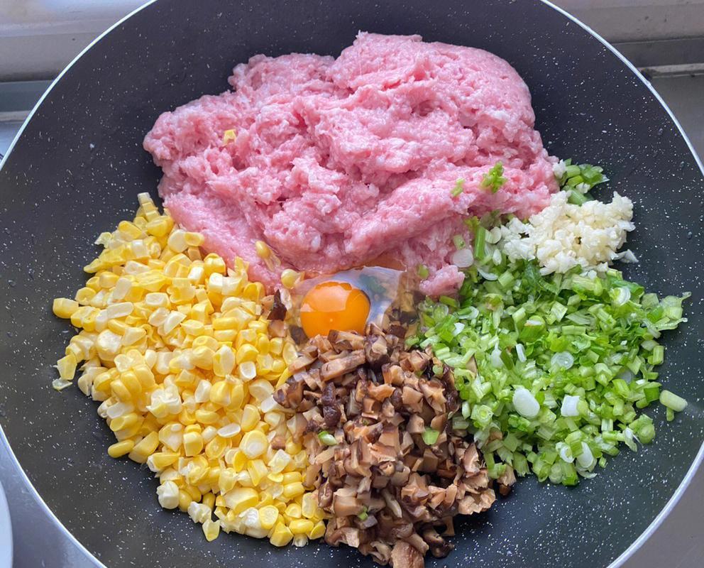 2玉米從飽滿的玉米棒上一顆顆剝下,清洗, 切碎,與香菇丁放一起