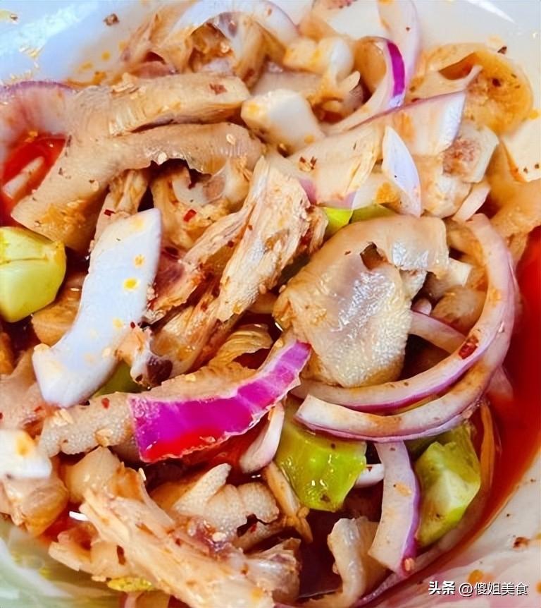 可不是嘛,脆爽的雞爪配上甜甜的洋蔥絲,一口下去,酸辣開胃,剛纔的油膩感全消了。這道菜最先光盤,連湯汁都被我爸蘸饅頭喫了。