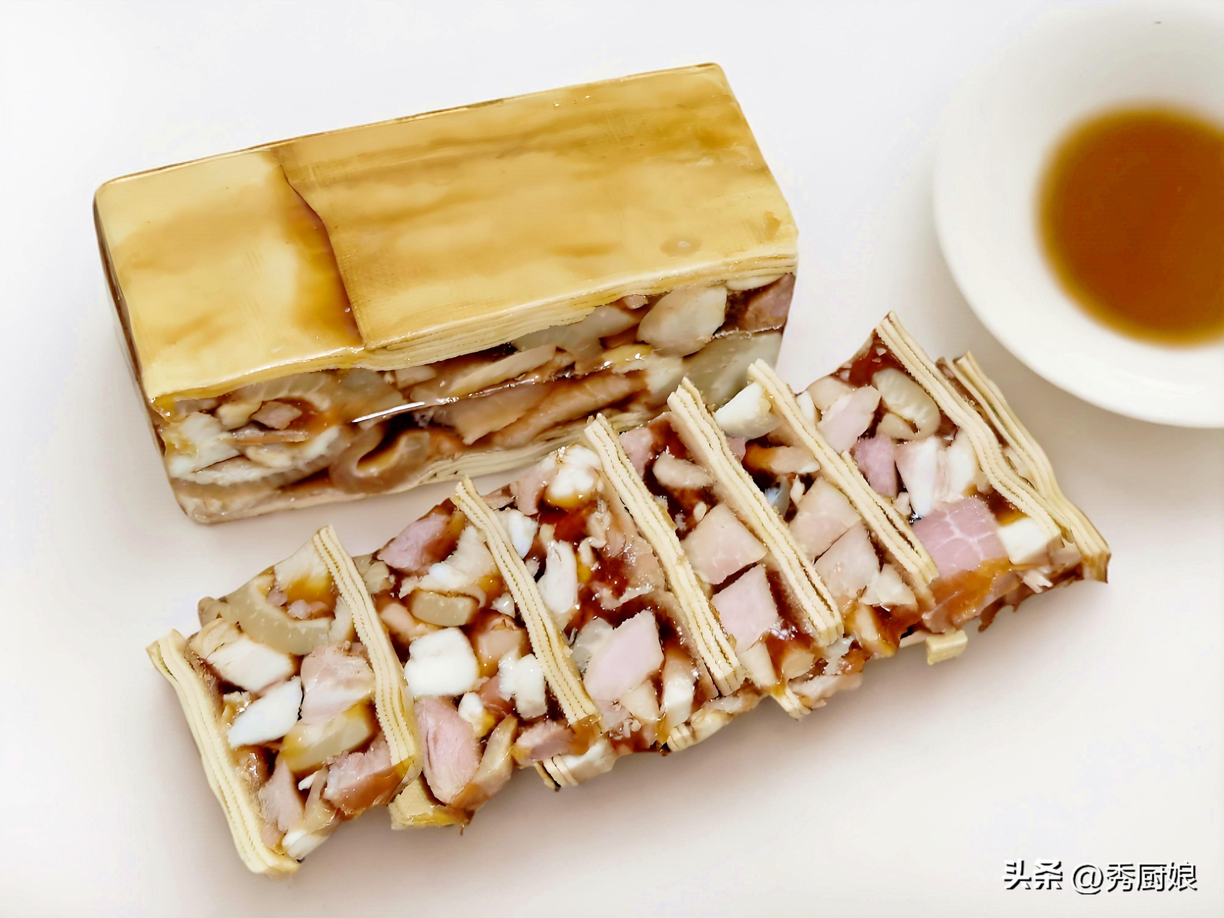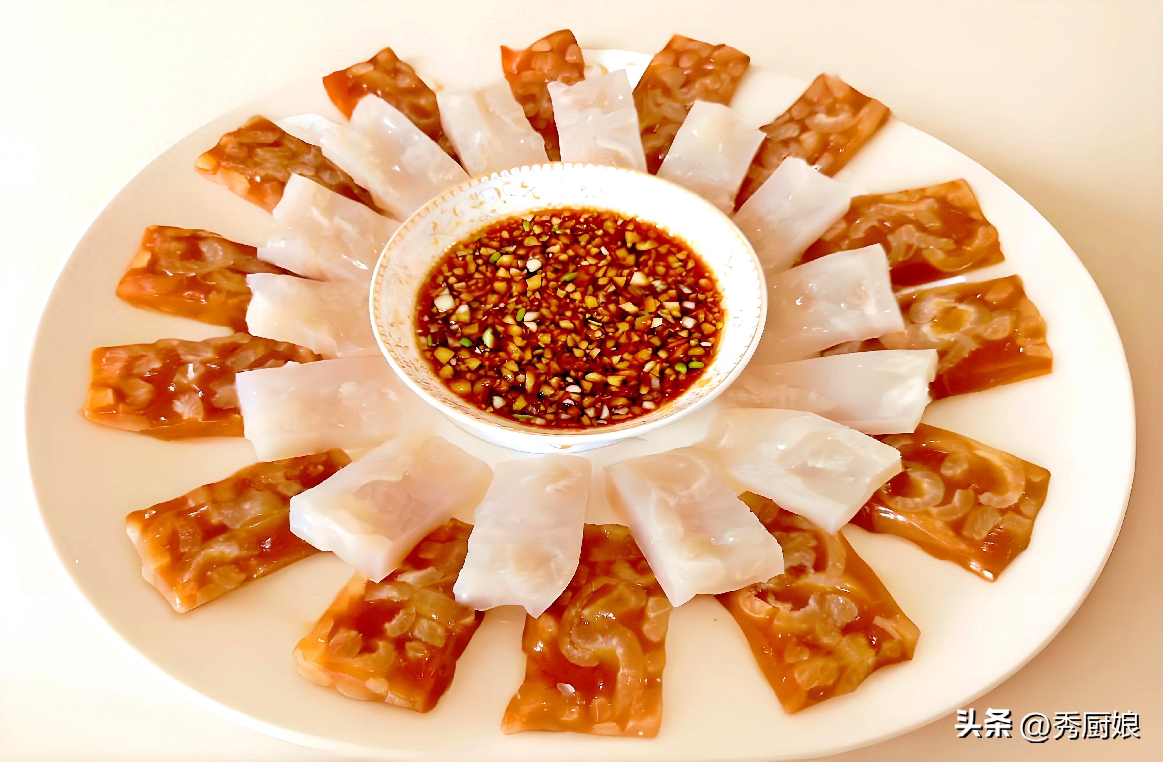 皮凍切厚片擺盤,調個靈魂蘸料:蒜末、生抽、香醋、幾滴香油,喜歡喫辣的加點油辣子。夾一塊顫巍巍的皮凍,蘸滿料汁送入口中,那爽滑彈牙、鮮美不膩的滋味,真是給肉都不換!