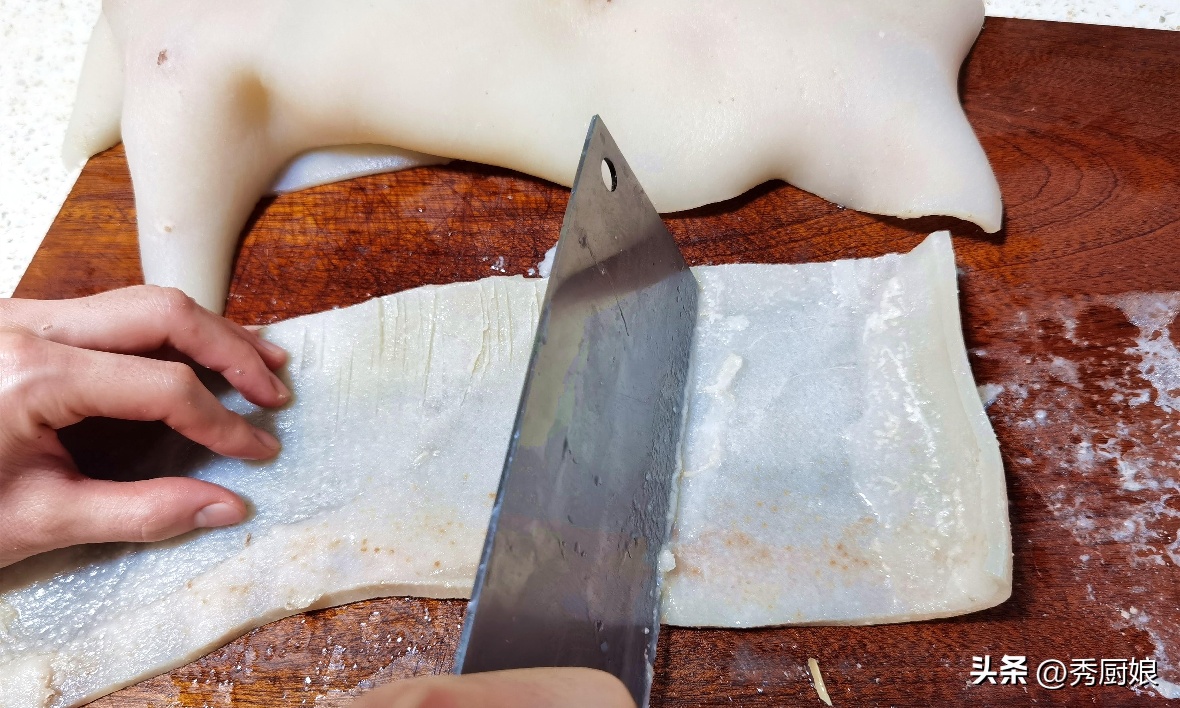 4. 將豬皮切成細條(越細膠質越容易析出),加一勺鹽反覆搓揉2分鐘,然後用溫水沖洗三遍,直到水變清澈。這一步能有效去腥。