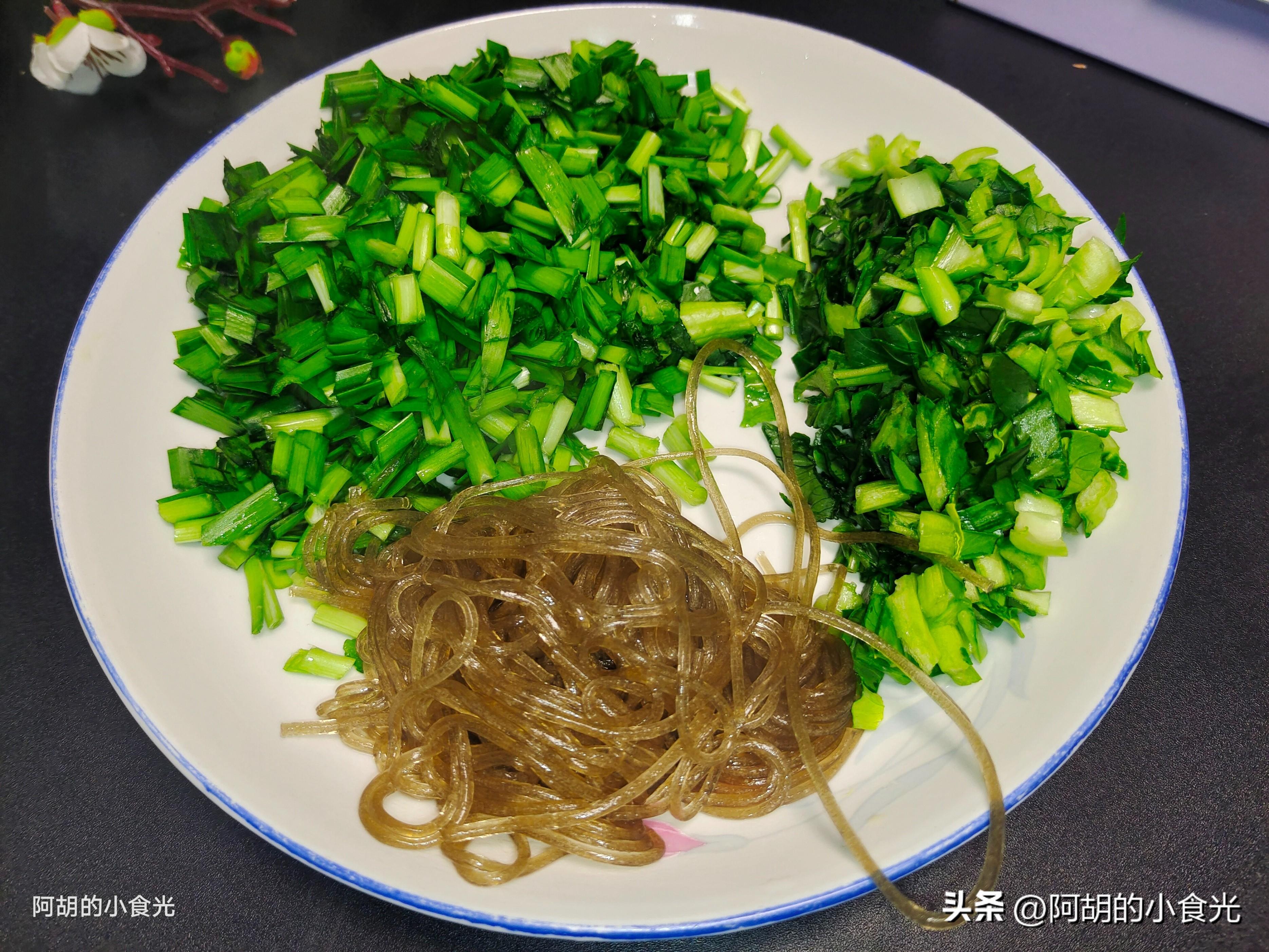 第二步:準備的主要配菜就是韭菜一把,洗乾淨後將其切成小段待用,還可以搭配一些小青菜切碎,再來一把粉條用溫水泡軟後備用,一些蔥薑絲作爲小料使用。還有兩個雞蛋充分攪散後備用。