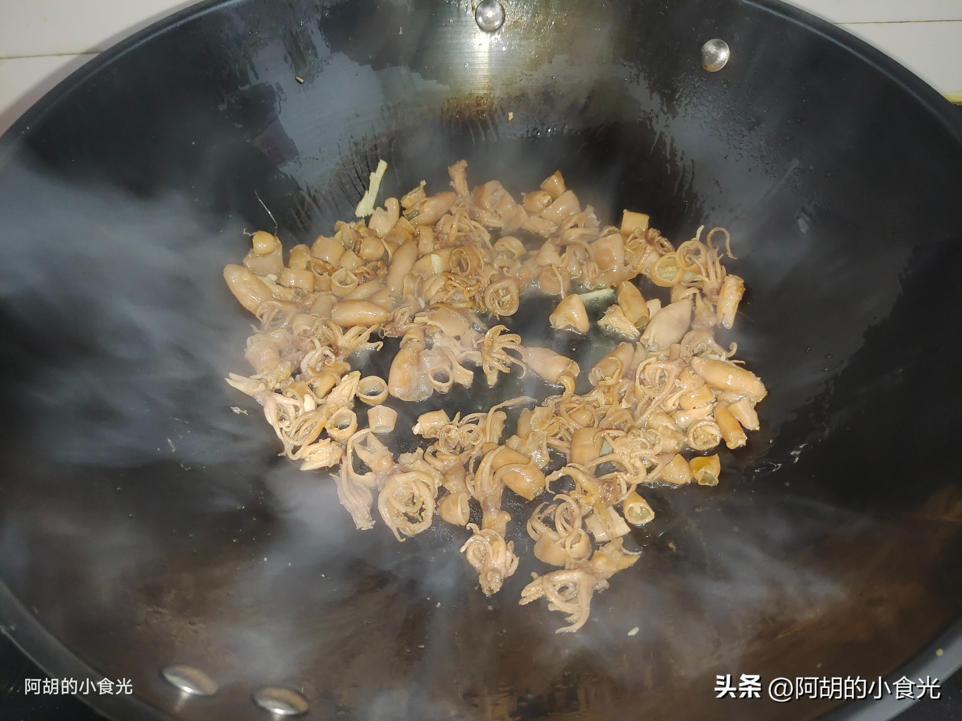 第三步:食材都處理好後就可以開火烹飪。先是把鍋烘乾,淋入一些菜籽油燒熱,把蔥薑絲下鍋保持香味,接着把焯水後的籽烏下鍋炒一炒,炒去一些水分激發出食材的鮮香味。