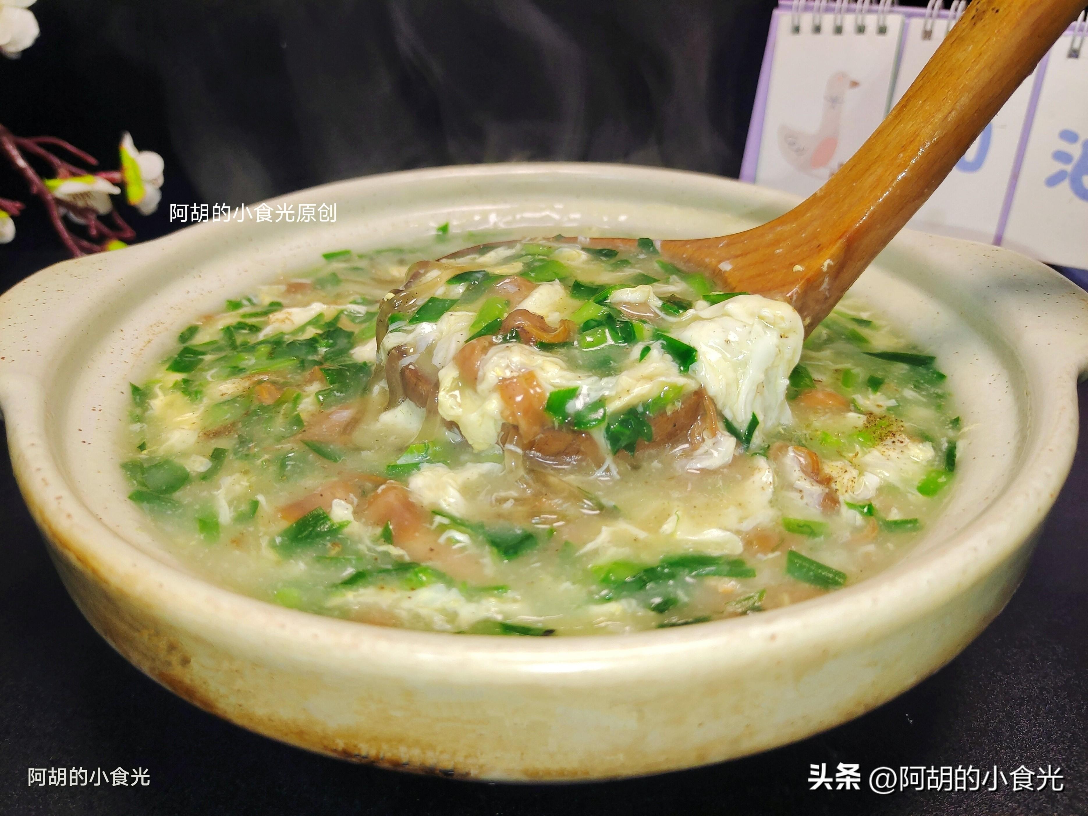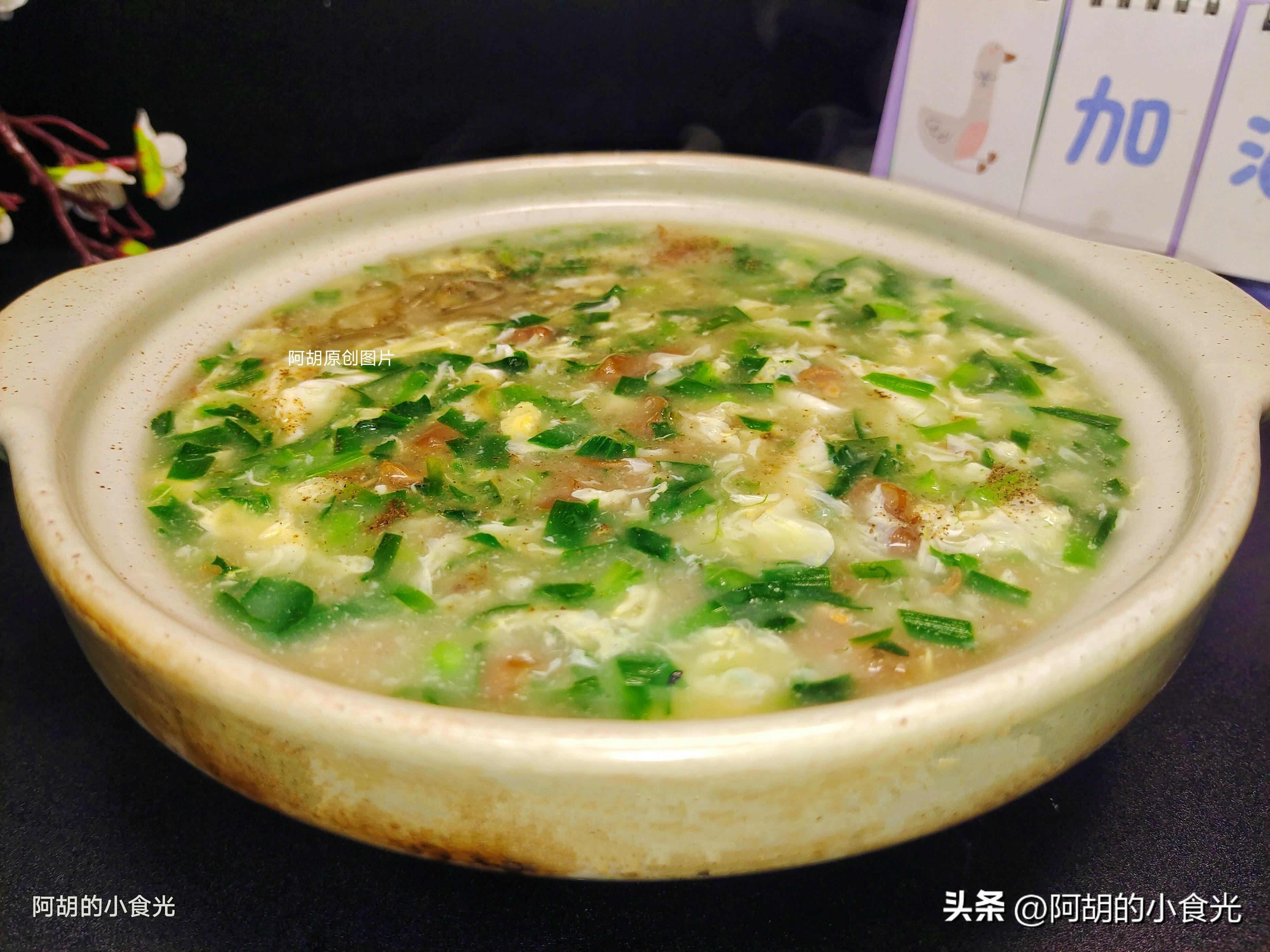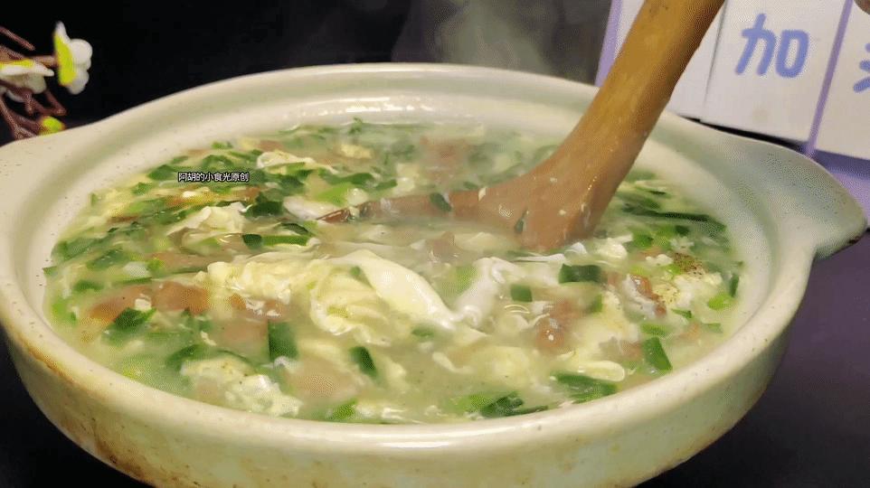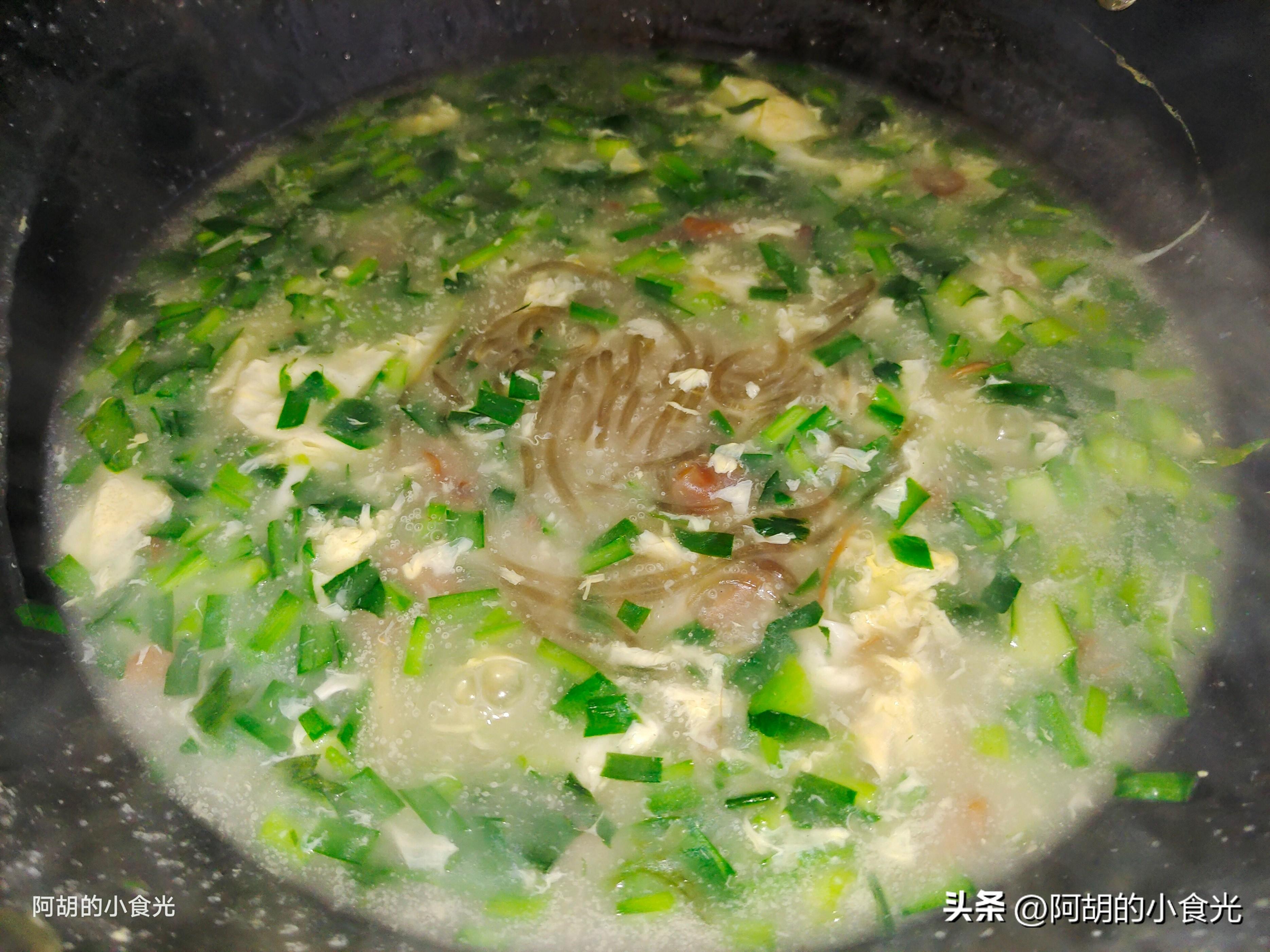 今天這碗湯的食材還算是簡單的,有小海鮮幹籽烏、韭菜、青菜、雞蛋和粉條,成菜是一道順滑濃稠的羹湯,其中最主要的提鮮食材就是籽烏,簡單炒一炒再和其它食材煮一煮,勾個芡就可以出鍋,幾分鐘時間,一道鮮美有熱乎的鮮湯就可以上桌了。
