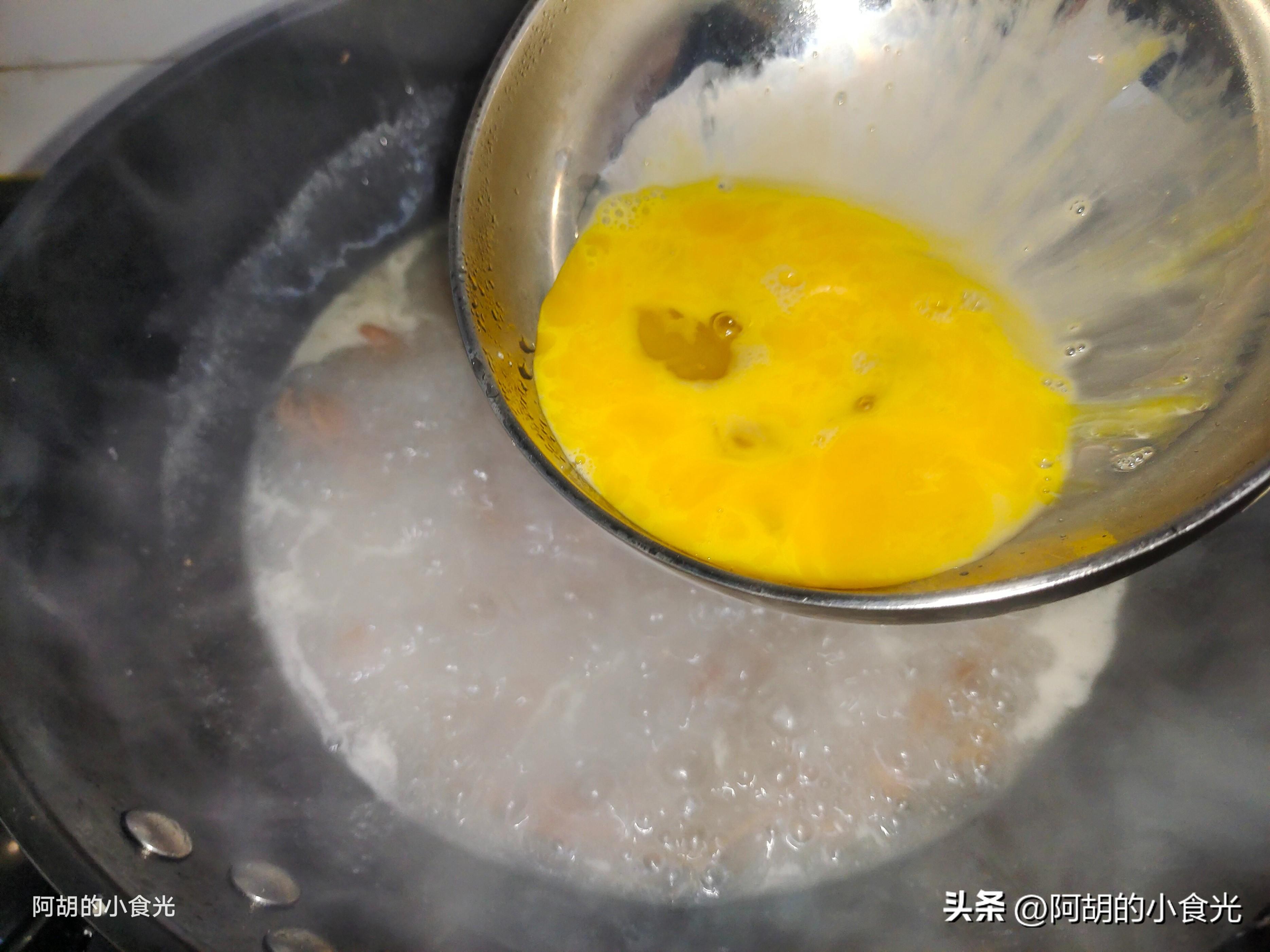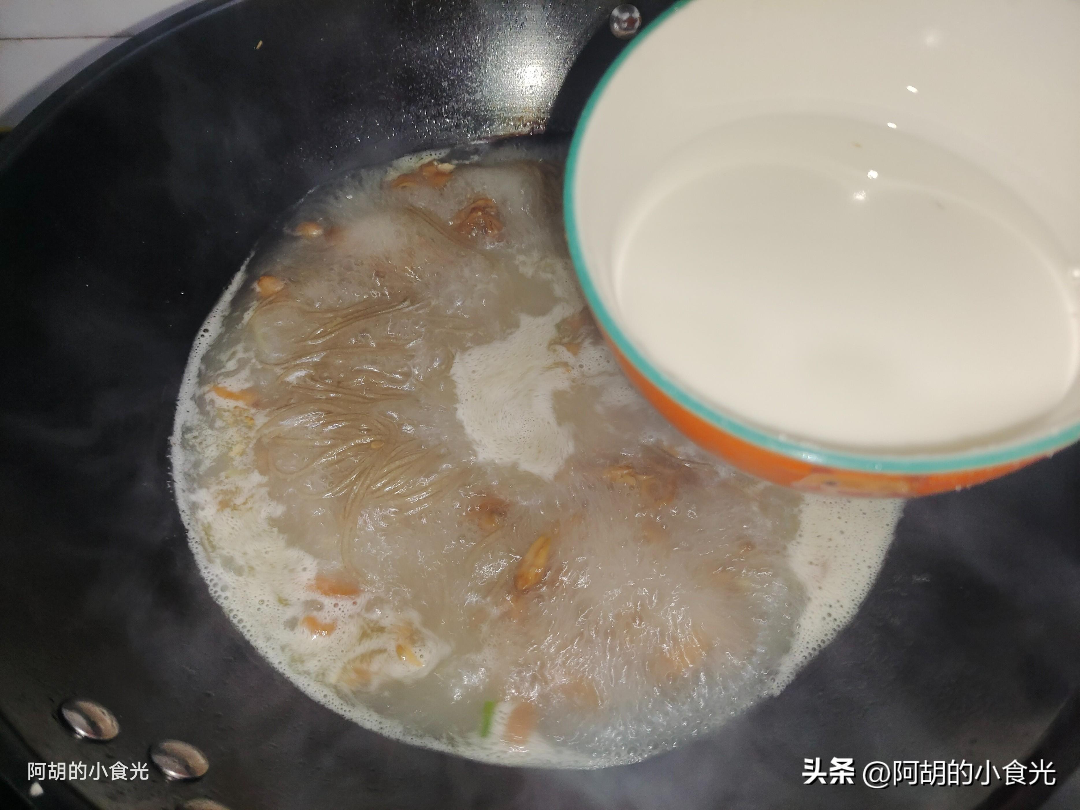 第四步:準備一些開水直接衝入鍋中,大火煮開煮沸後把表面的一些浮沫清理一下,而後把粉條先下入鍋中保持大火煮個三兩分鐘,調味就加入一些食鹽、雞精即可。再用涼水稀釋一些幹澱粉淋入鍋中,同時鍋內保持大火用勺子攪拌讓湯汁漸漸濃稠一些即可。