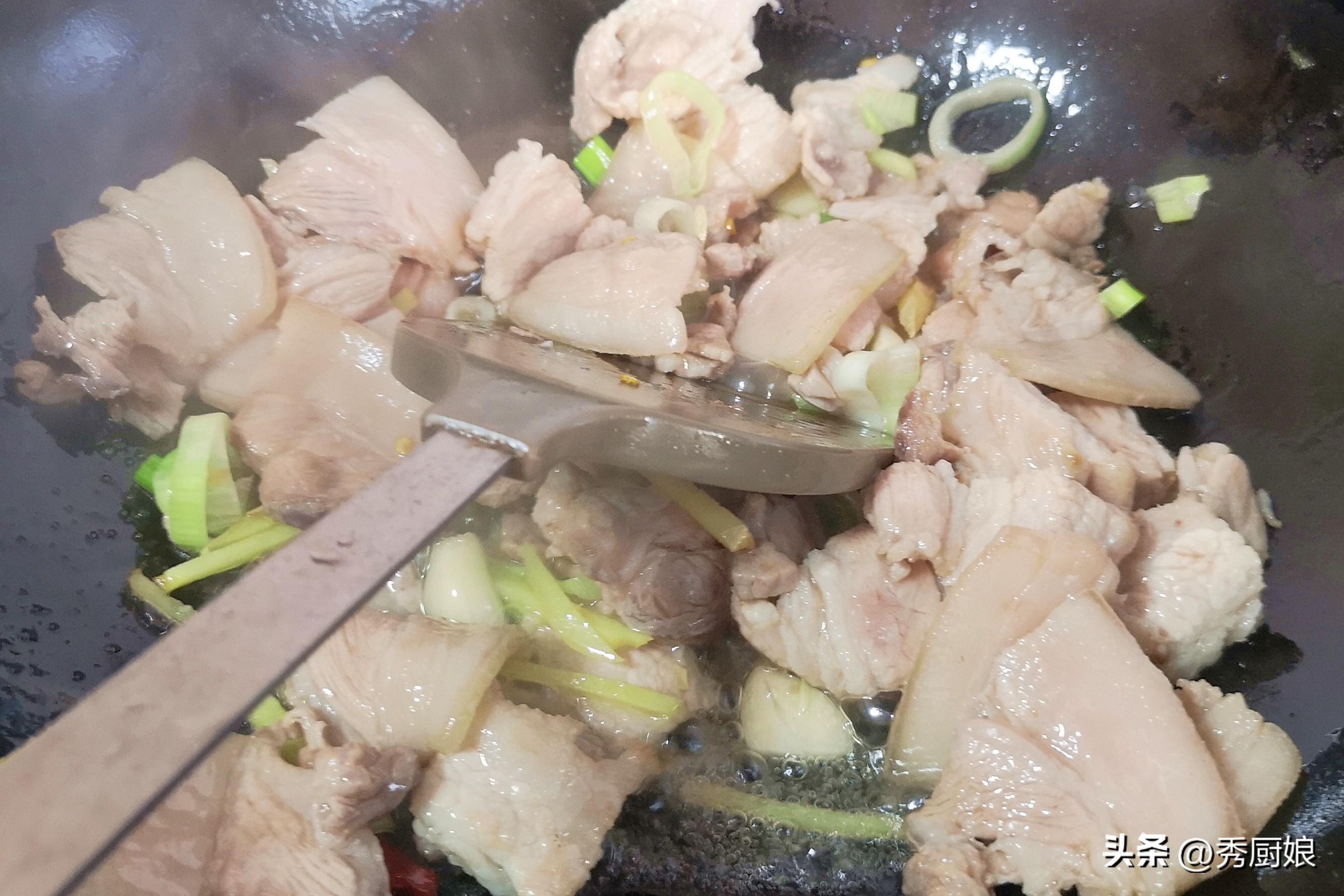 2. 炒香佐料:在豬肉里加入蔥段、薑片、兩三瓣拍碎的大蒜,再來兩個幹辣椒(不喫辣可以不放),一起炒出香味。這時候滿廚房都是複合香氣,鄰居都能聞見。